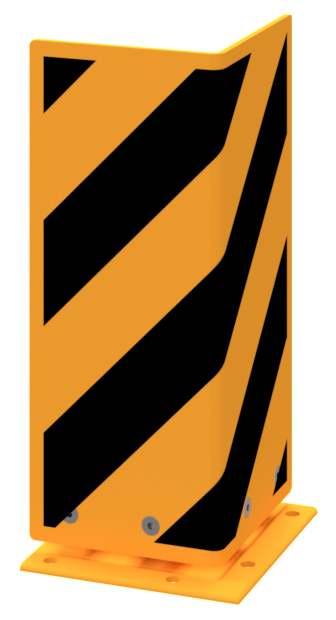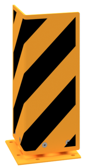 Anfahrschutz ·elastisch, neigbar ·Stahlblech 6mm stark ·gelb beschichtet mit schwarzen Streifen ·zum Aufdüben ·Höhe: 400 mm ·Schenkellänge: 160 mm ·Neigungswinkel: 15°