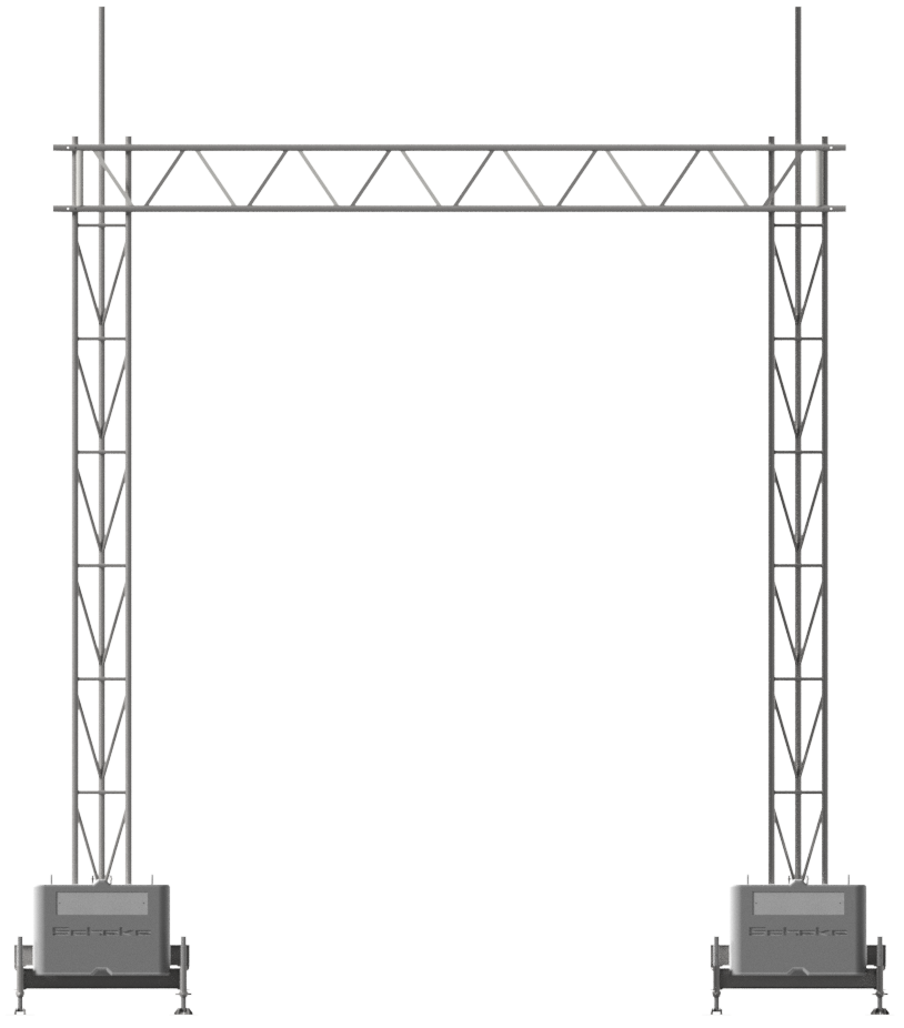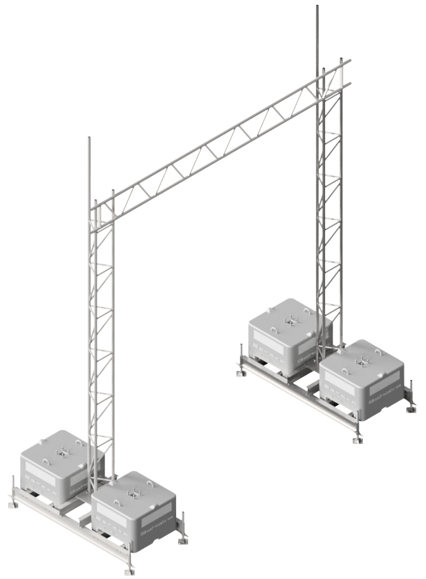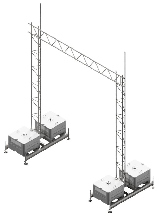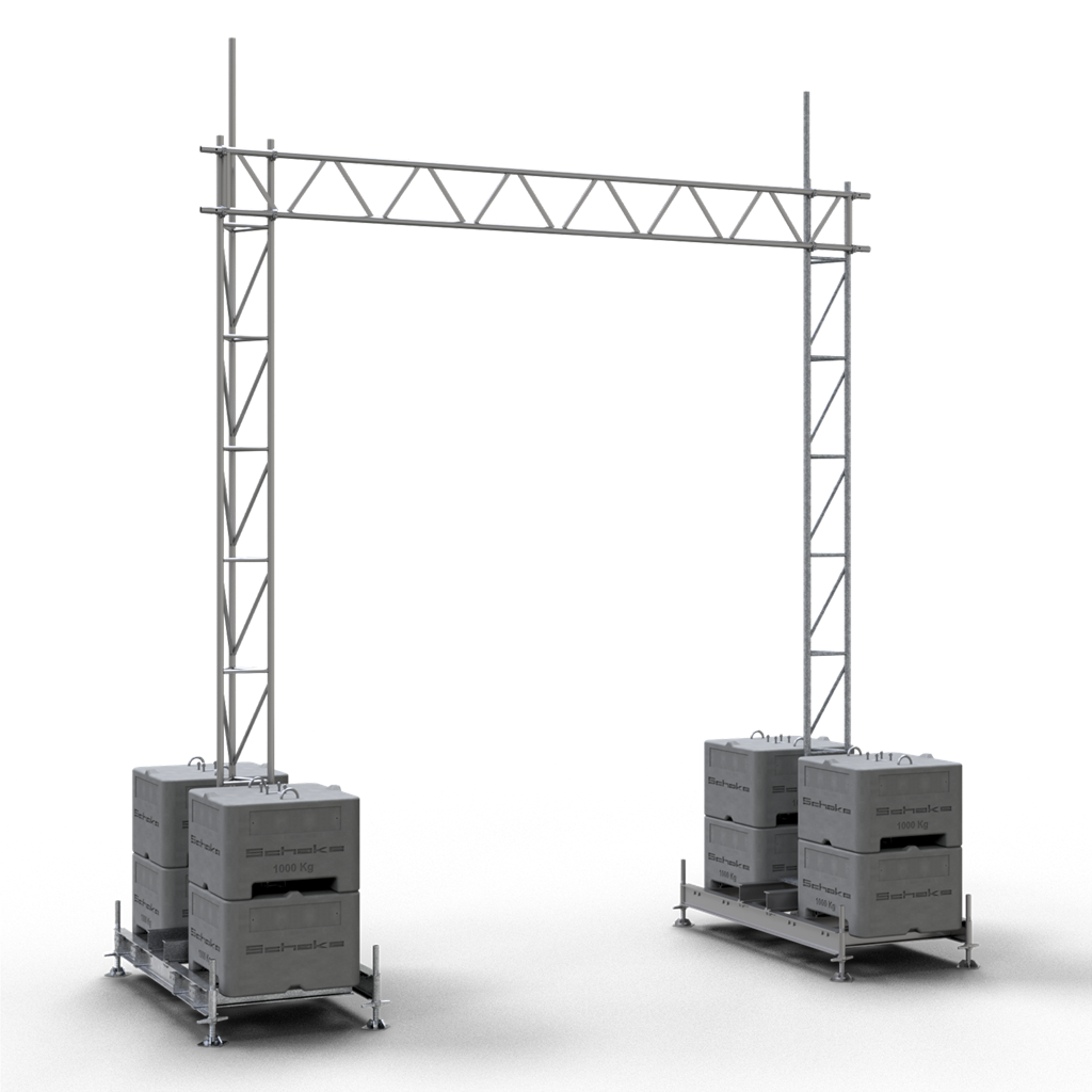 Aufstellvorrichtungen Brücke bestehend aus: 2 x Aufstellrahmen für Beton-Aufstellvorichtungen (Art.-Nr. 35350) 8 x Beton-Aufstellvorrichtung 1000 kg (Art.-Nr. 3F121) 2 x Gitterrohrmast 350, verzinkt, 6,15 m (Art.-Nr. 353017) 8 x Normalkupplung BB, feuerverzinkt (Art.-Nr. 3F120-5) 1 x Stahl-Gitterträger 450