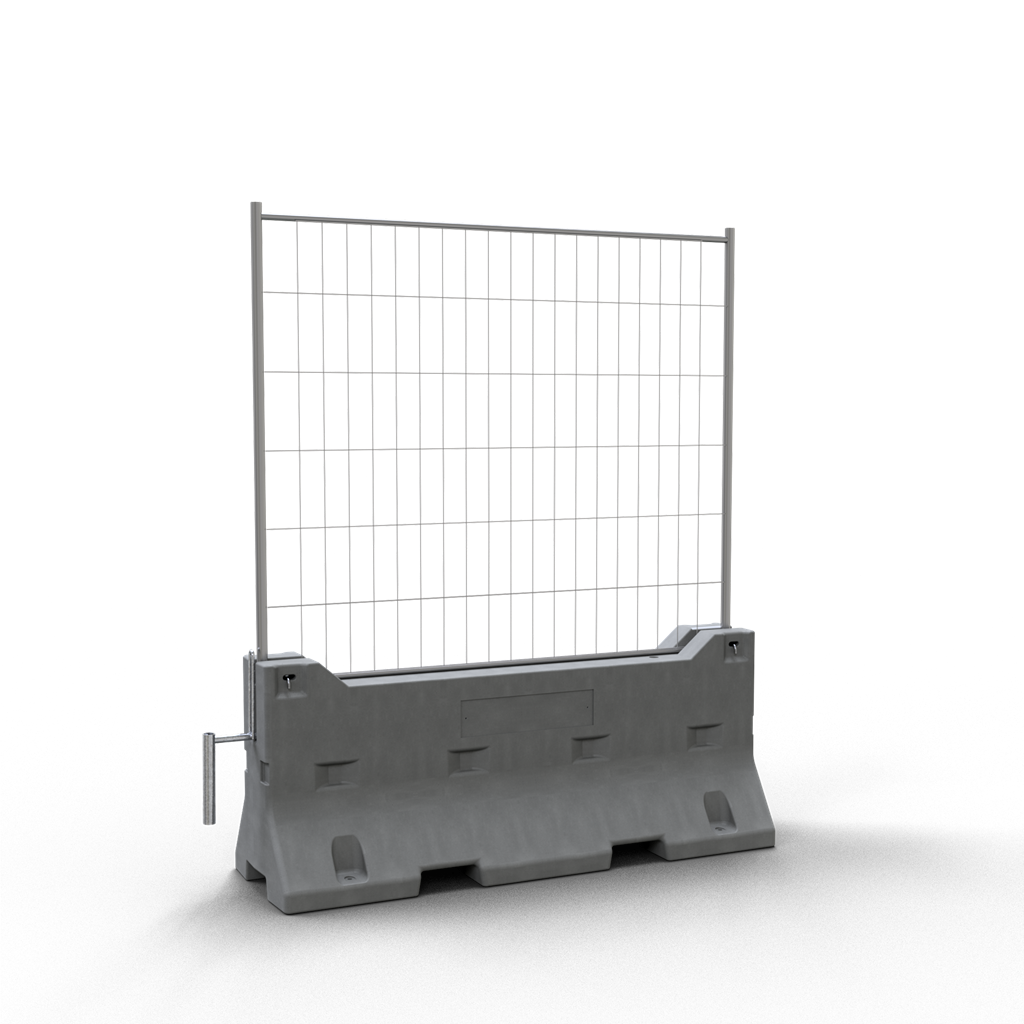 Betonleitwand SET 1 bestehend aus: 1 x Betonleitwand, zertifiziert nach ISO 22343-1: 2023 (Art.-Nr. 3F200) 1 x Mobilzaun 1 x Verbindungselement (Art.-Nr. 3F200-1) 2 x Sicherungsbolzen (Art.-Nr. 3F200-2)