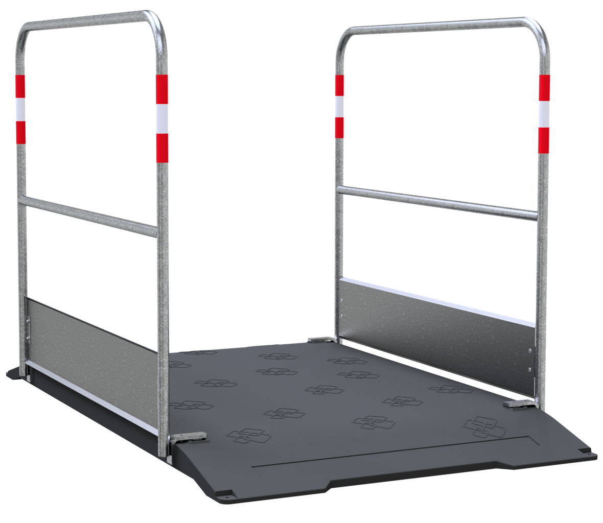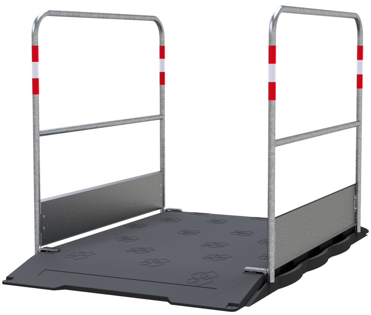 Grabenbrücke aus Kunststoff ·Länge: 1,70 m ·Breite: 1,00 m ·Nutzfläche aus rutschfestem Kunststoff ·mit seitlich einsteckbaren Geländern aus verzinktem Stahl ·mit Tragegriff und Tastleiste ·die Geländer sind mit rot-weiß-roten Reflektorstreifen ausgestattet ·diese Grabenbrücken entsprechen der Arbeitsstätten- und ZTV-SA ·Tragfähigkeit: 1000 kg
