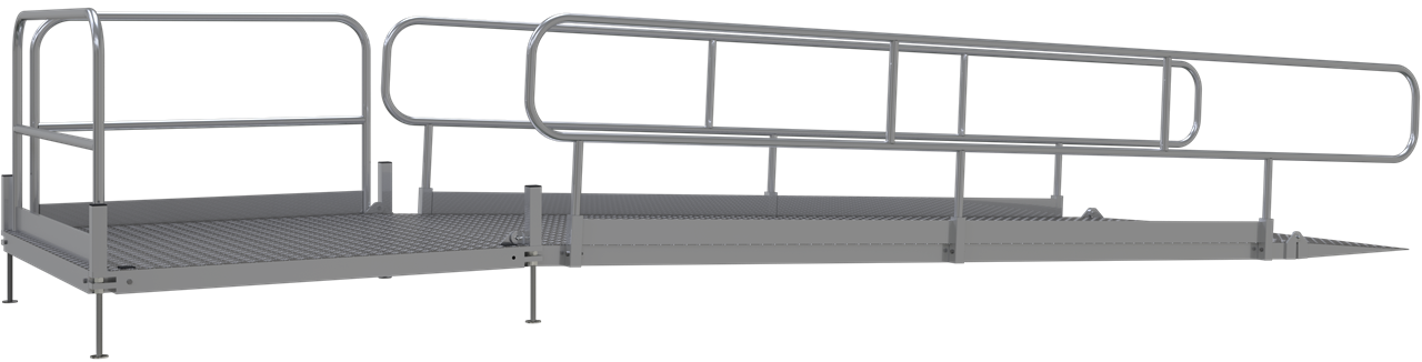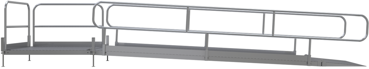 Rollstuhlrampe Zum barrierefreien Auffahren von Bordsteinen mit Rollstühlen, Kinderwagen o.Ä.. ·Aluminium-Konstruktion mit umlegbaren Geländern ·Auffahrsteigung < 6 % ·Höhe ist mittels Spindelfüßen stufenlos einstellbar zur genauen Anpassungen an die Bordsteinhöhe ·Innenbreite ca. 1,5 m ·Gesamtlänge: ca. 6,6 m ·Geländerhöhe: ca. 0,9 m ·mit Knieholm und Tastleiste ·Aluminium