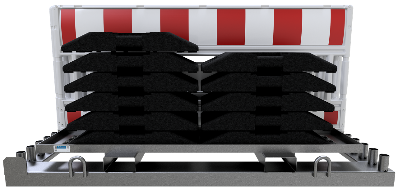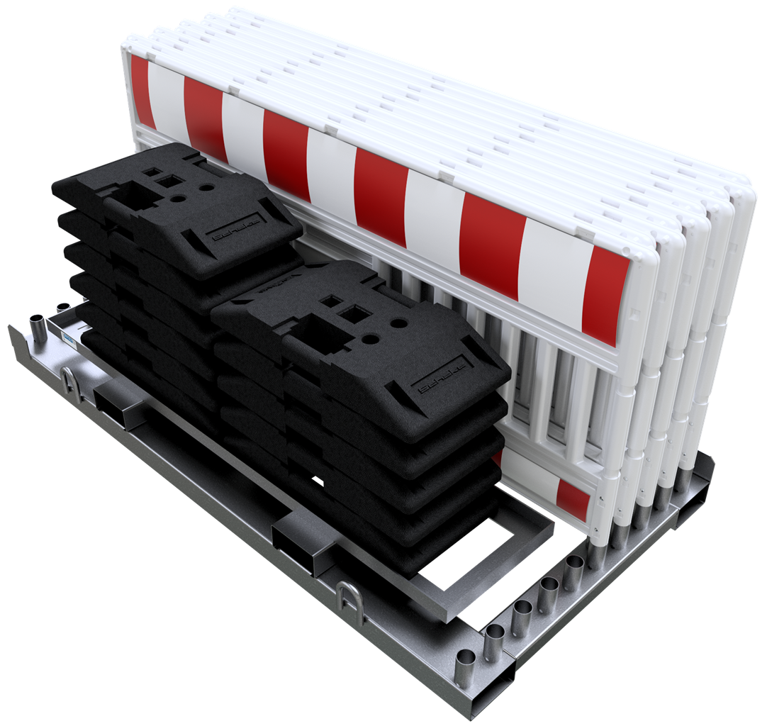 Absperrschrankengitter SET1 bestehend aus: 1 x Lager- und Transporttraverse für Absperrschrankengitter (Art.-Nr. 32000) 1 x Aufsatzteil für K1-Fußplatten (Art.-Nr. 32000-A) 10 x Absperrschrankengitter 11 x TL-Fußplatte nach K1, 30 kg (Art.-Nr. 31991) 2 x Zurrgurt 2-tlg. mit Ratsche (Art.-Nr. 50352-4)