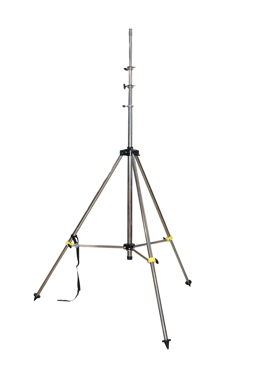 Das professionelle Teleskop-Dreibeinstativ aus Edelstahl ist mit einer Luftdämpfung versehen. Damit fährt das Stativ nach dem Lösen der Flügelschrauben sanft ein, selbst wenn ein Scheinwerfercontainer mit zwei Scheinwerfern montiert ist. Die Gefahr von Beschädigungen oder sogar Verletzungen beim Einfahren des Stativs ist damit gebannt.