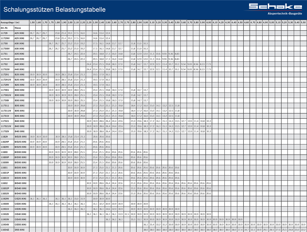 Die zulässigen Tragkräfte sind abhängig von den Auszugslängen der Schalungsstütze.