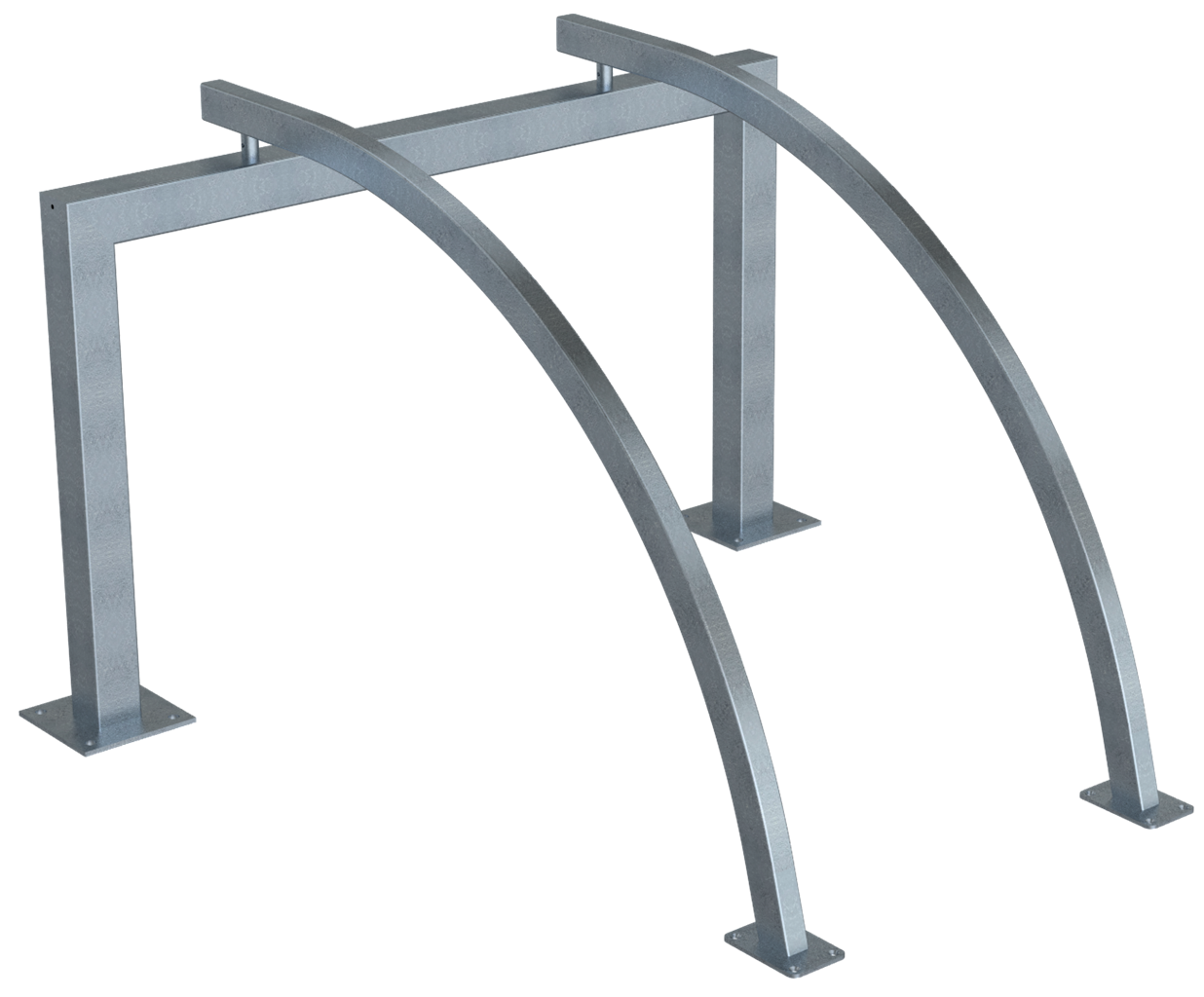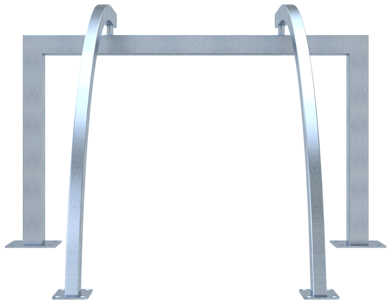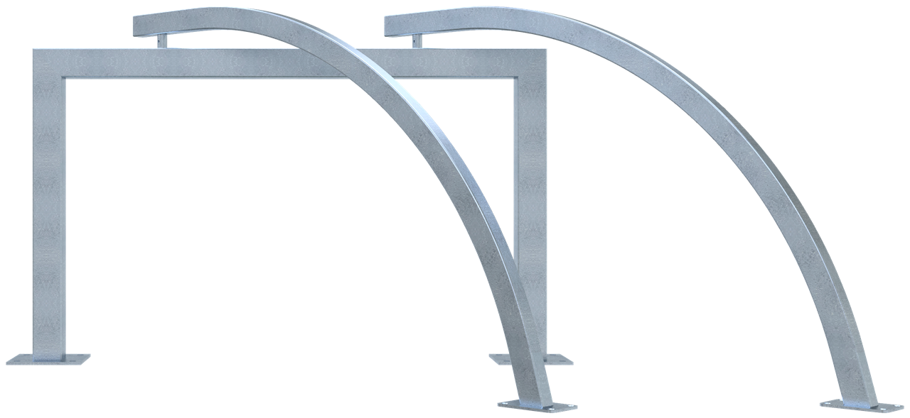 Fahrradanlehnbügel als Reihenanlage Rahmen aus Vierkantrohr 80 x 80 mm mit aufschraubbaren gebogenen Anlehnbügeln aus Vierkantrohr 60 x 40 mm, mit Bodenplatten zum Aufdübeln, feuerverzinkt Gesamthöhe: ca. 950 mm Bügelabstand: ca. 700 mm Stellraumtiefe bei 90° Aufstellung: ca. 1500 mm