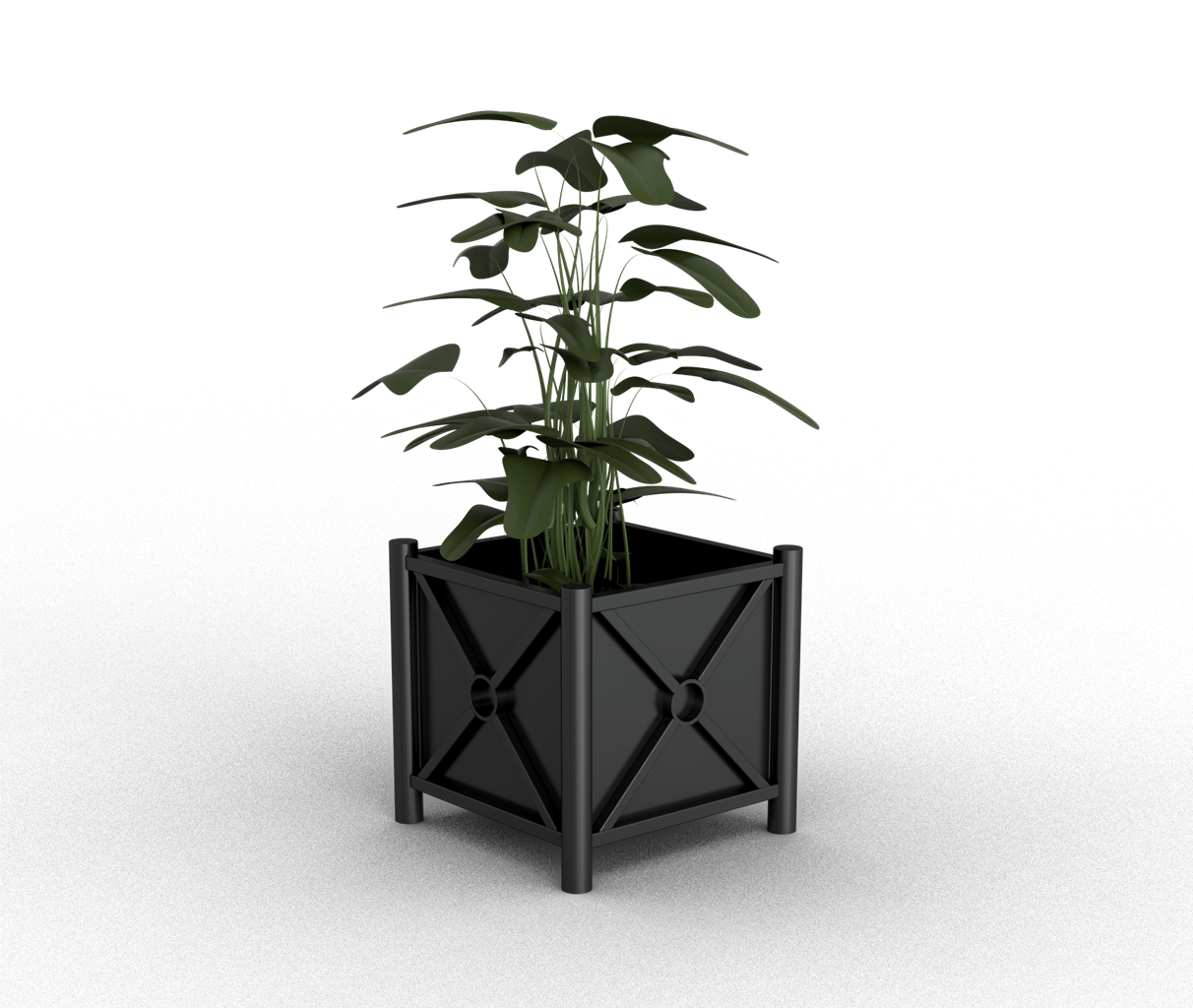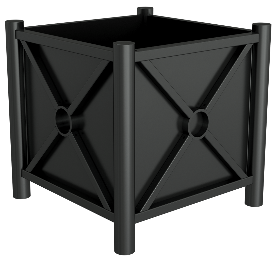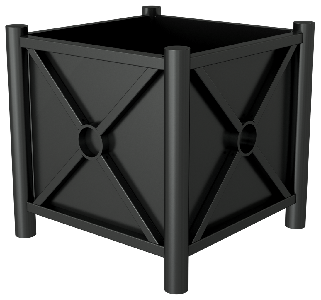 Pflanzbehälter Rundrohre Ø 60 mm senkrecht ·feuerverzinkt und beschichtet DB 703 ·Stahlrohr 30 x 30 mm waagerecht ·mit seitlichen Stahlblechen und Bodenblech ·Außenmaß: 640 x 640 mm ·Innenmaß: 520 x 520 mm ·Tiefenmaß: 500 mm (Behälter)