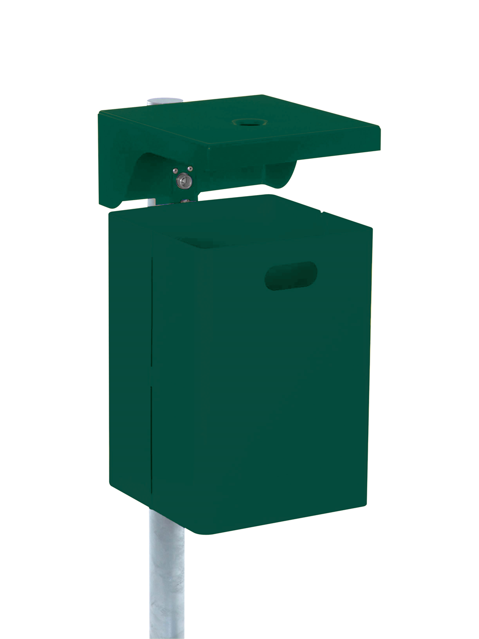 Abfallbehälter zur Wand- oder Pfostenbefestigung Rechteck-Abfallbehälter mit Dach ungelocht, Inhalt ca. 40 L, inkl. Ascher, kpl. mit Schiene und Schlüssel, Behälterabmessungen 440 x 310 x 310 mm