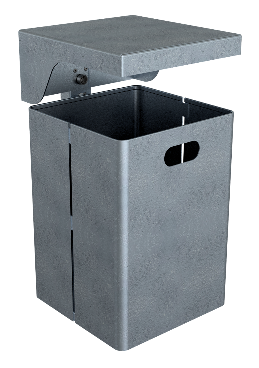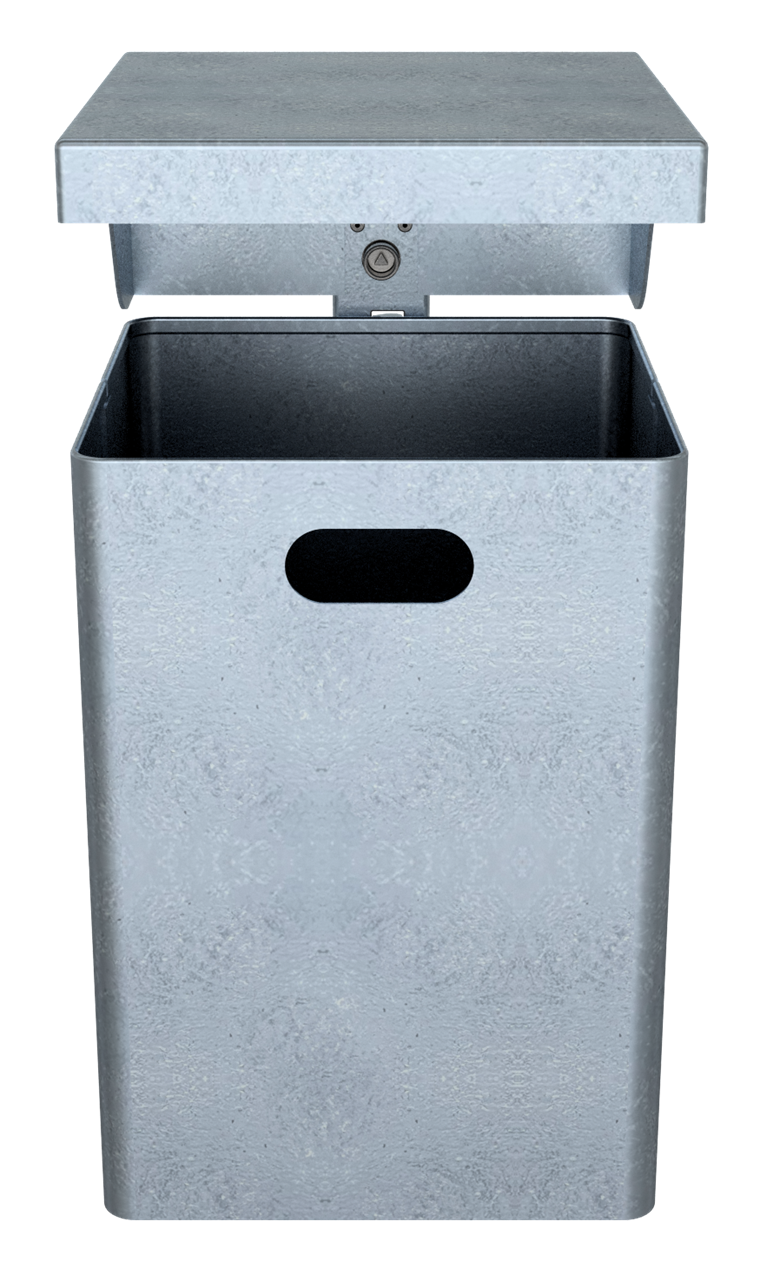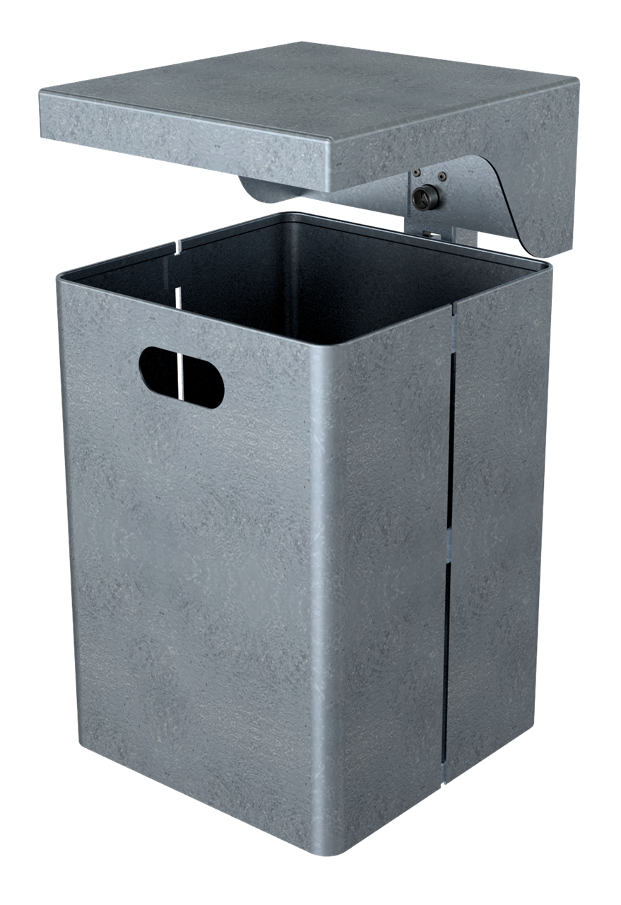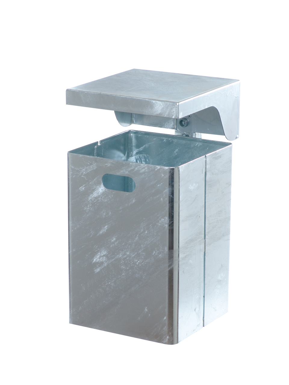 Abfallbehälter zur Wand- oder Pfostenbefestigung Rechteck-Abfallbehälter mit Dach ungelocht, Inhalt ca. 40 L, kpl. mit Schiene und Schlüssel Behälterabmessungen 440 x 310 x 310 mm