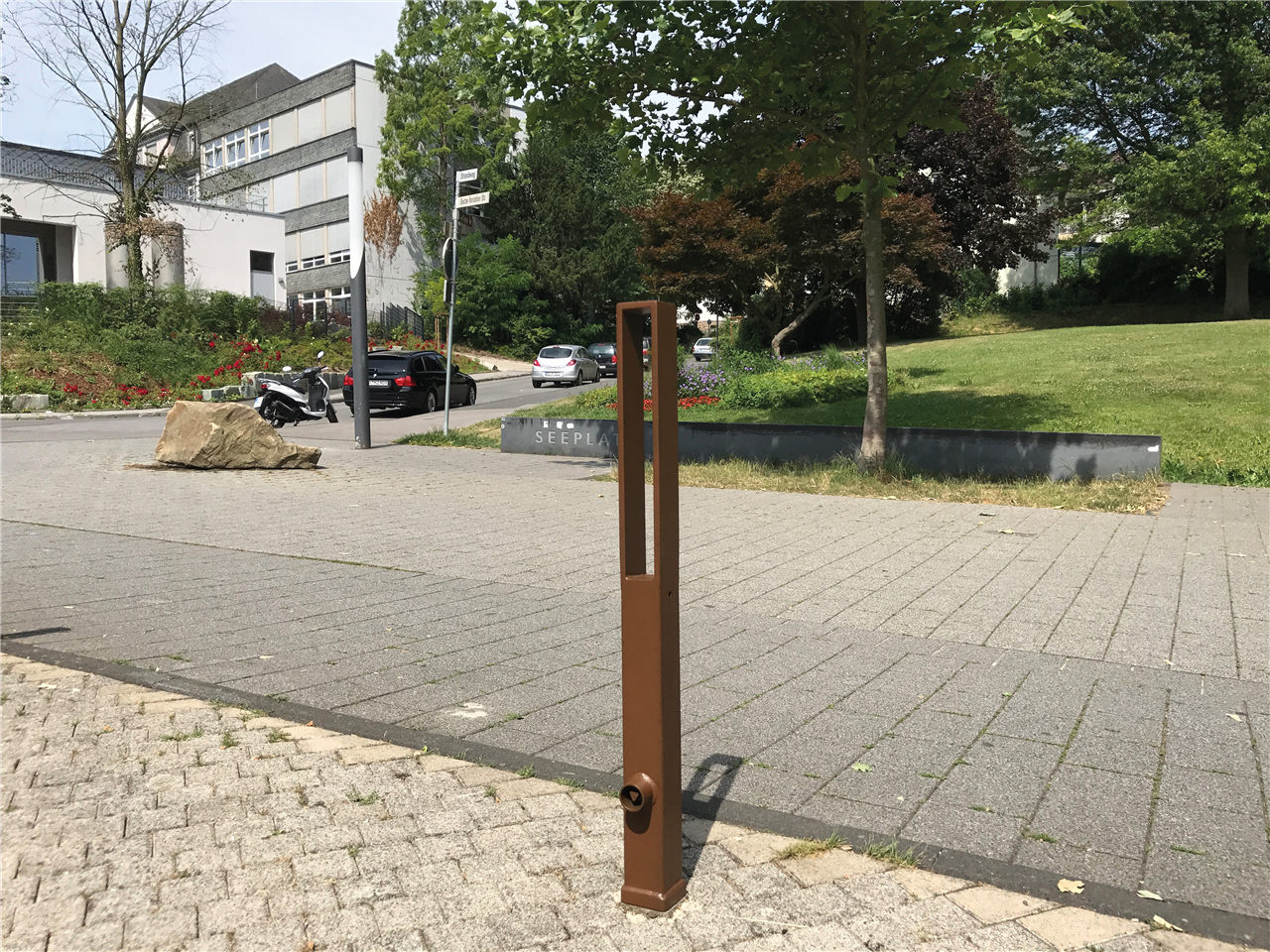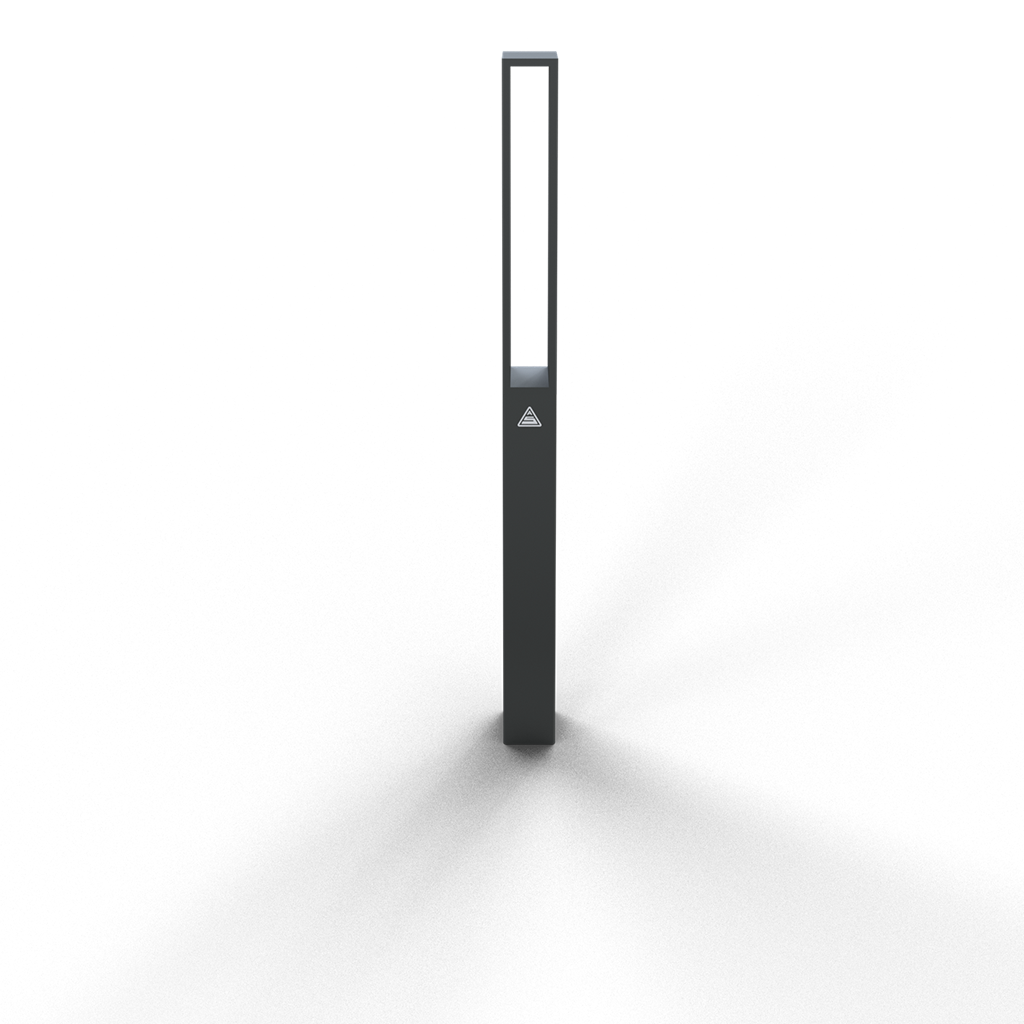 Stilpoller aus Vierkantstahlrohr 70 x 70 mm Oberteil Flachstahl, ca. 950 mm Überflur, feuerverzinkt und DB 703 beschichtet