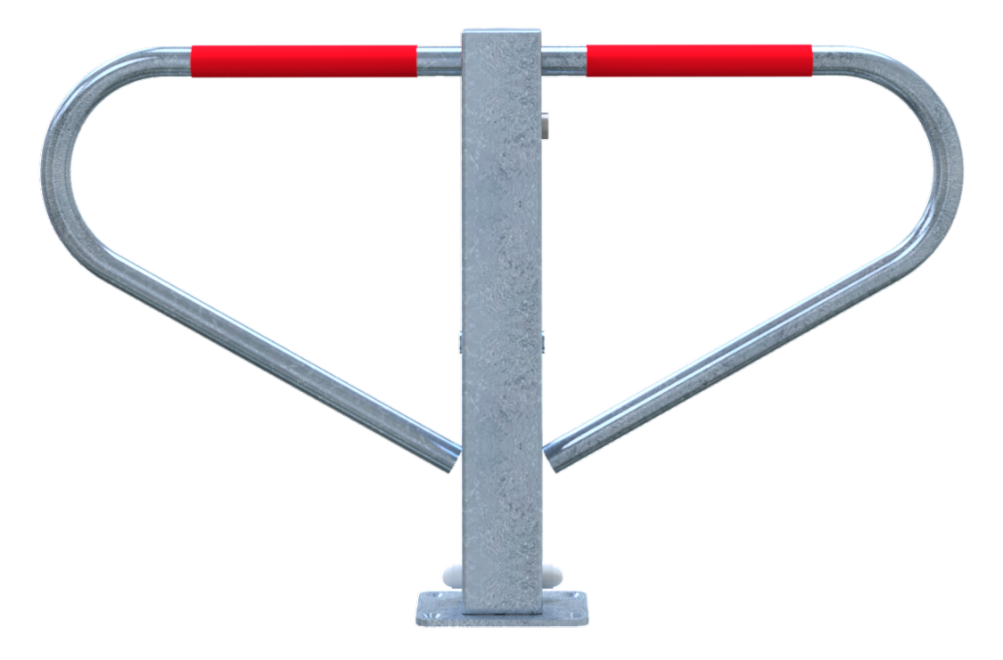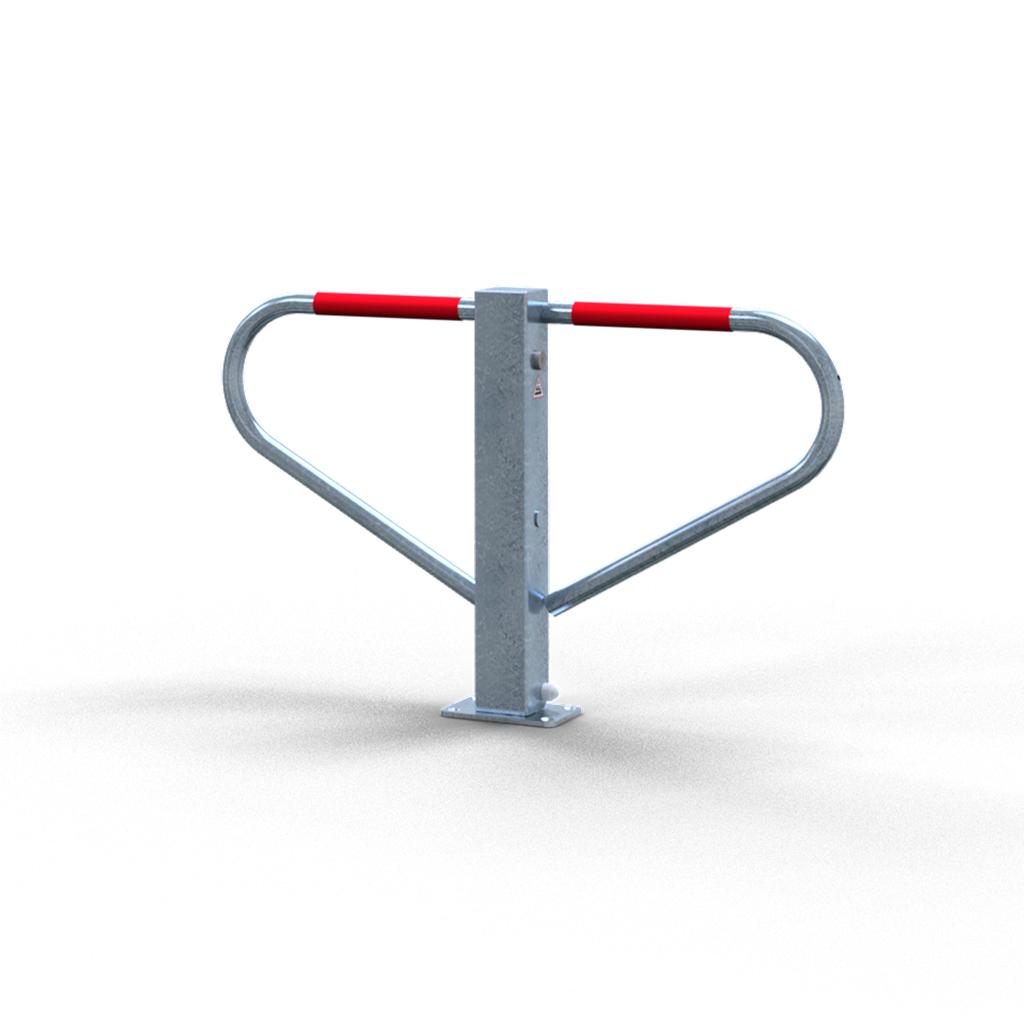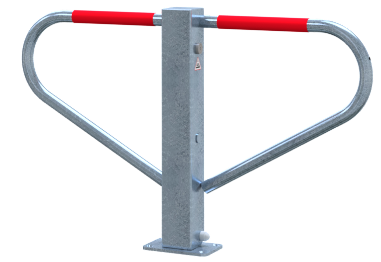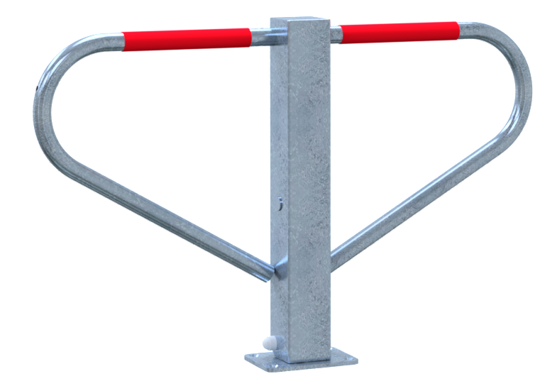 Parkplatzsperre, umlegbar Vierkantrohr 70 x 70 mm mit seitlichen Rundrohrbügeln Gesamtbreite ca. 800 mm Überflur 500 mm selbsteinrastende Verriegelung umlegbar, mit Rundzylinder drei Schlüssel, selbsteinrastende Verriegelung