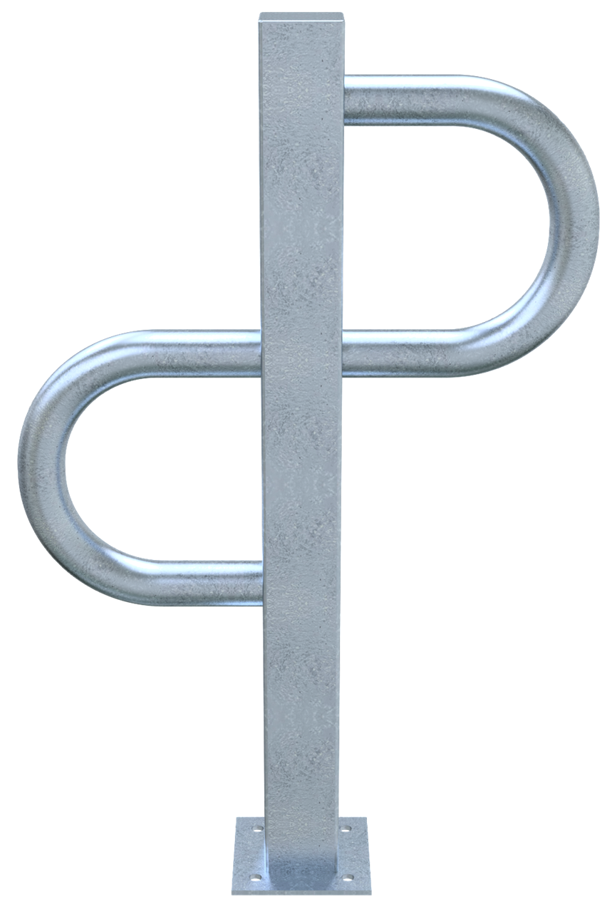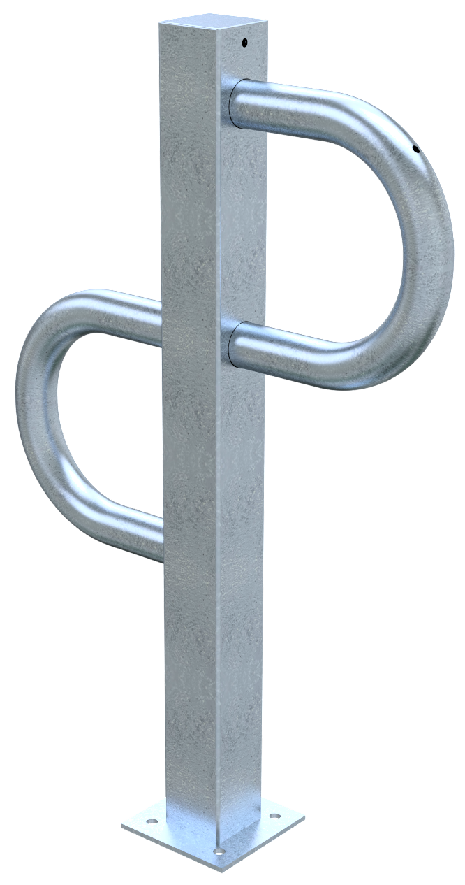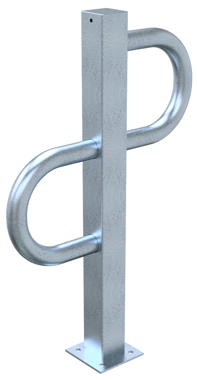 Fahrradständer Einzelparker ·zum Aufdübeln ·aus Vierkantrohr 80x80 mm ·höhe: 800mm ·mit Bodenplatte 150x150 mm ·mit seitlichen Rohrbügel aus Rundrohr Ø 60 mm