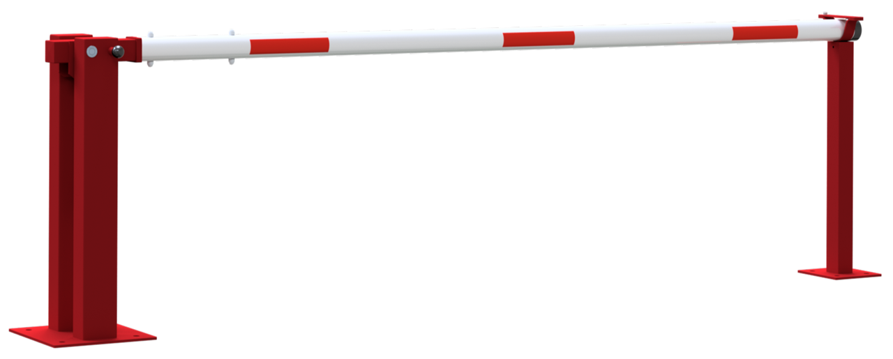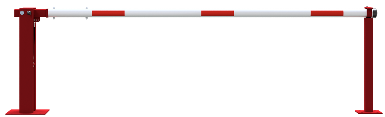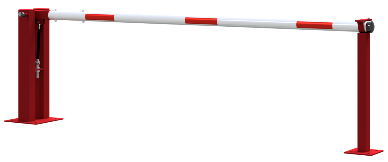 Handschranke mit Gasdruckfeder und festem Auflagepfosten Hauptstütze: Stahlkonstruktion 120 x 80 mm Rechteckrohr mit Bodenplatte 360 x 360 x 8 mm zum Aufdübeln, inkl. 4 Bohrungen Ø 20 mm für Anker, feuerverzinkt und rot pulverbeschichtet, Arretierung durch Bolzen bei geöffneter und geschlossener Schranke Auflagepfosten: Stahlrohr 70 x 70 mm mit Bodenplatte 220 x 220 x 8 mm, inkl. 4 Bohrungen Ø 20 mm für Anker Schrankenbaum: starkwandiges Ø 80 mm Aluminiumrohr, pulverbeschichtet mit rot refl. Streifen Verschluss am Auflagepfosten Gesamtbreite: lichte Weite + ca. 180 mm Höhe: ca. 950 mm Überflur Empfehlung: Seilzugverstärkung ab einer Sperrbreite von 6 m für zusätzliche Stabilität.