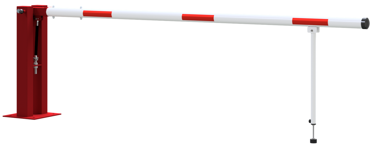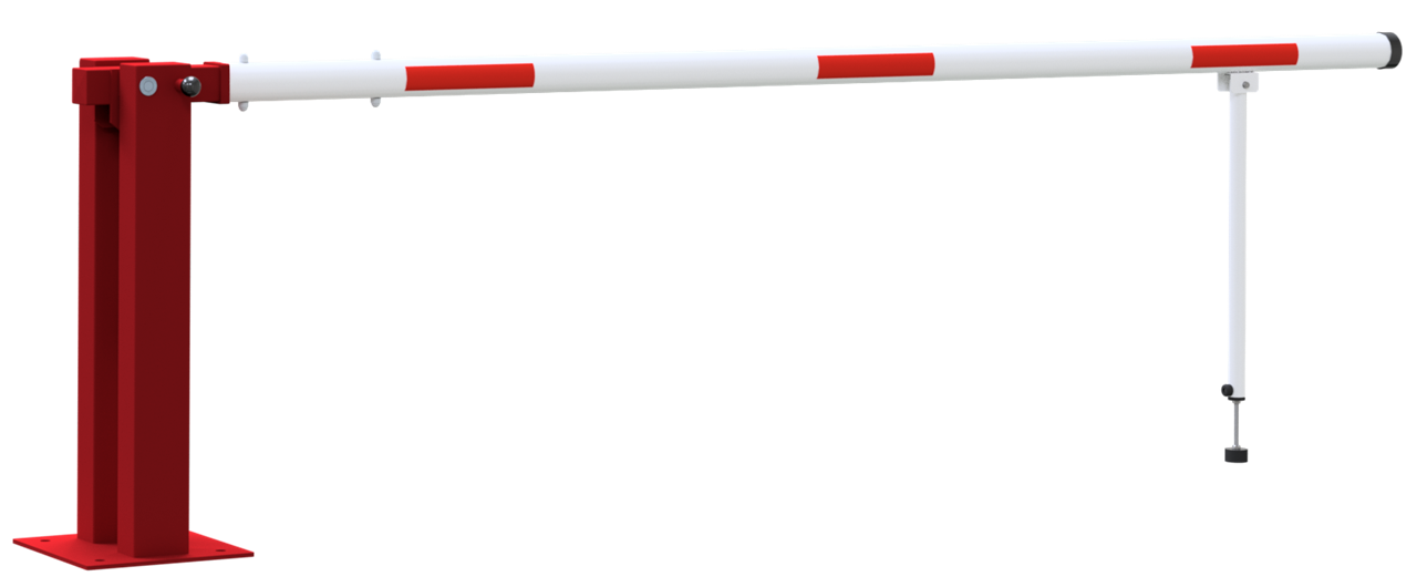 Handschranke mit Gasdruckfeder und Pendelstütze Hauptstütze: Stahlkonstruktion 120 x 80 mm Rechteckrohr mit Bodenplatte 360 x 360 x 8 mm zum Aufdübeln, inkl. 4 Bohrungen Ø 20 mm für Anker, feuerverzinkt und rot pulverbeschichtet, Arretierung durch Bolzen bei geöffneter und geschlossener Schranke Pendelstütze: Aluminiumrohr mit Ausgleichsfuß Schrankenbaum: starkwandiges Ø 80 mm Aluminiumrohr, pulverbeschichtet mit rot refl. Streifen Verschluss an der Hauptstütze Gesamtbreite: lichte Weite + ca. 180 mm