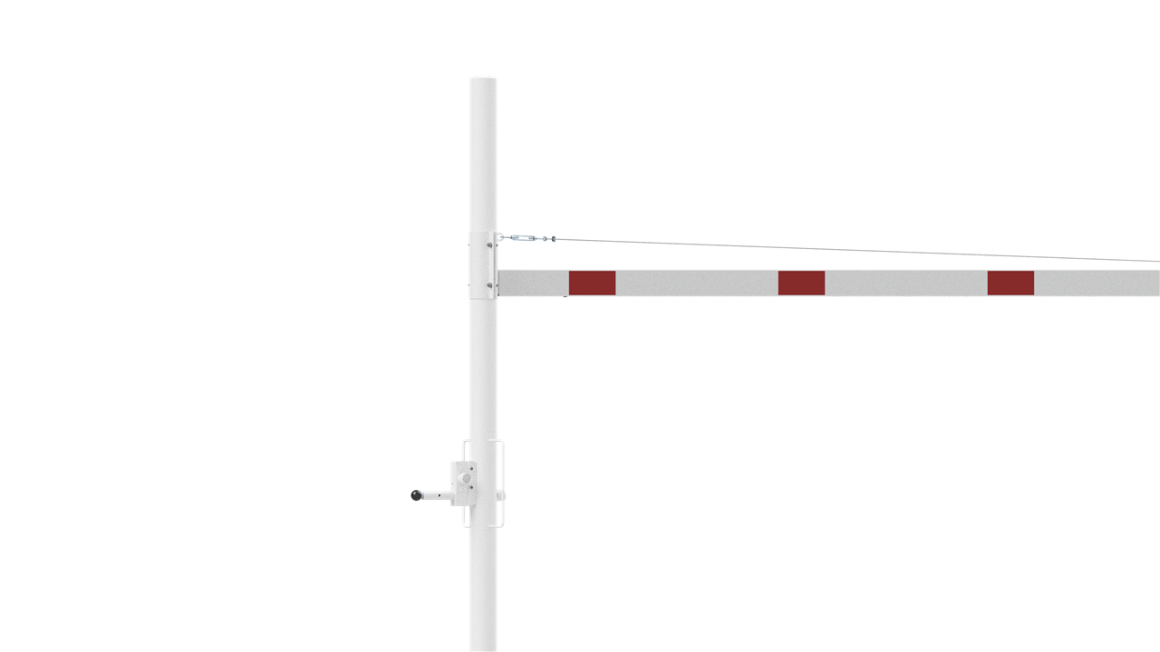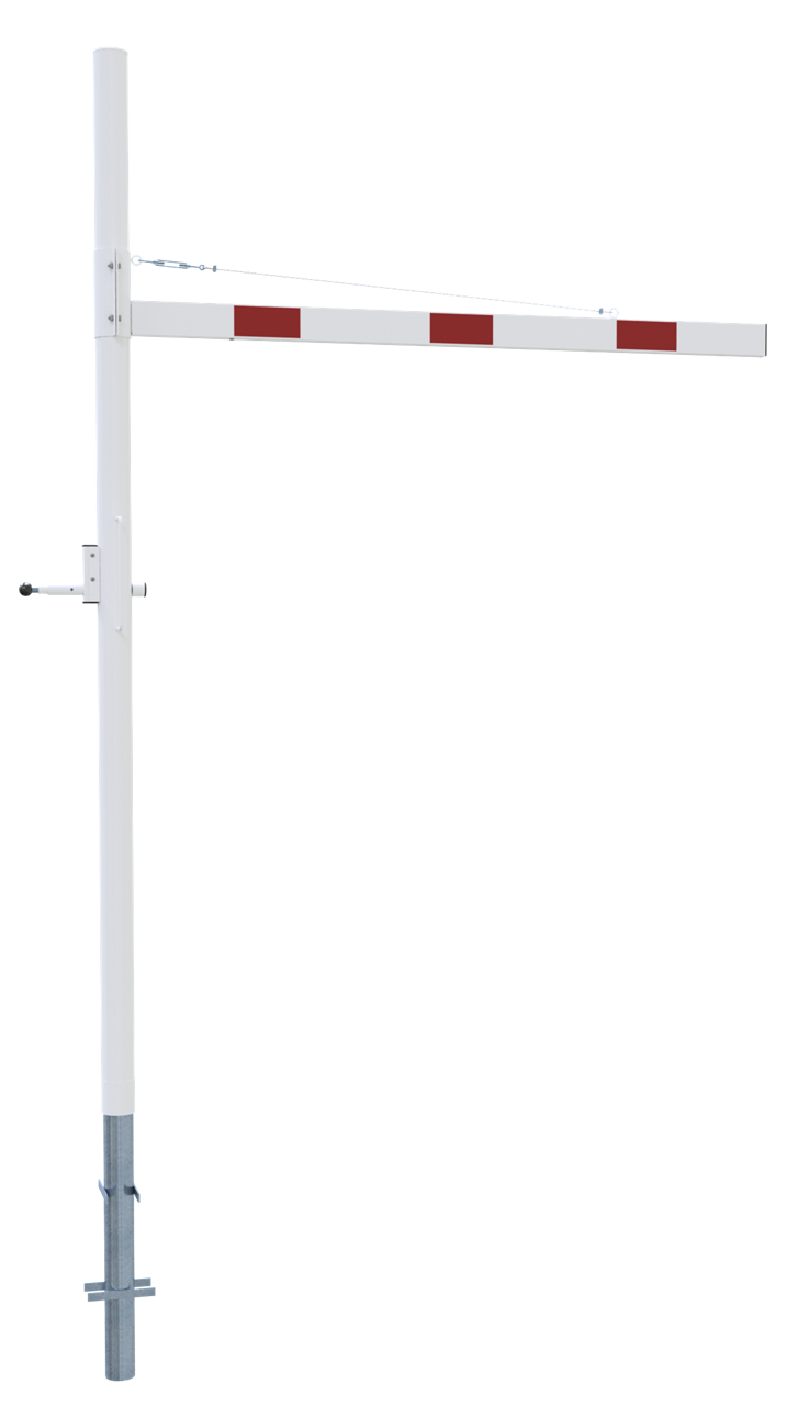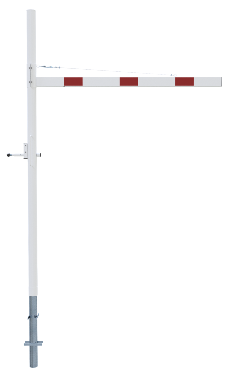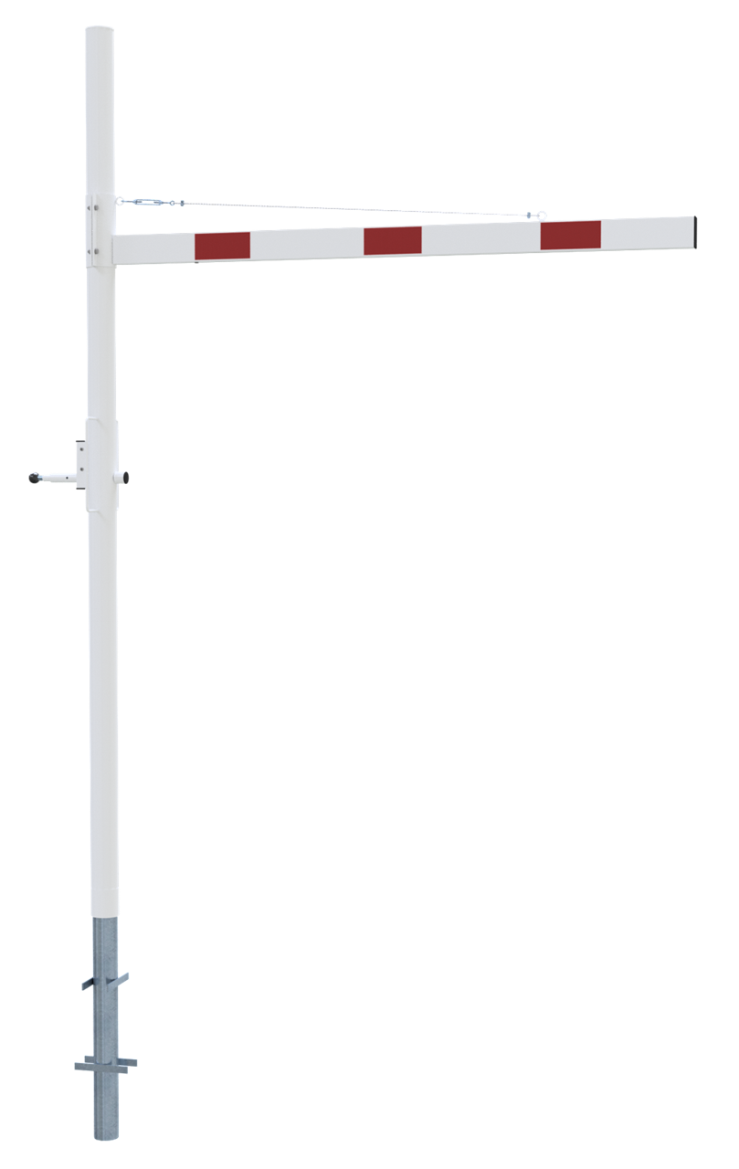 Höhenbegrenzer Horizontal schwenkbar, mit Seilzugverstärkung, Verriegelung geschlossen oder geöffnet mit Bolzen, vorgerichtet für Vorhangschloss oder mit Dreikantverschluss nach DIN 3223 bzw. Profilzylinderschloss, weiß beschichtet mit rot reflektierenden Leuchtstreifen 1-teilig Drehpfostenm aus Stahlrohr Ø 102 mm Querrohr aus Aluminium 100 x 50 mm Durchfahrtshöhe variabel einstellbar ca. 1800 mm - 2800mm Gesamthöhe Überflur ca. 3000 mm