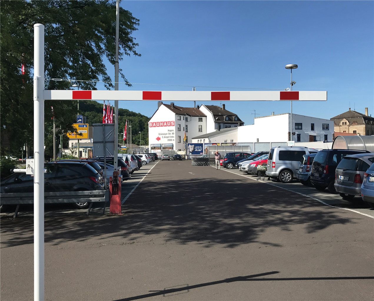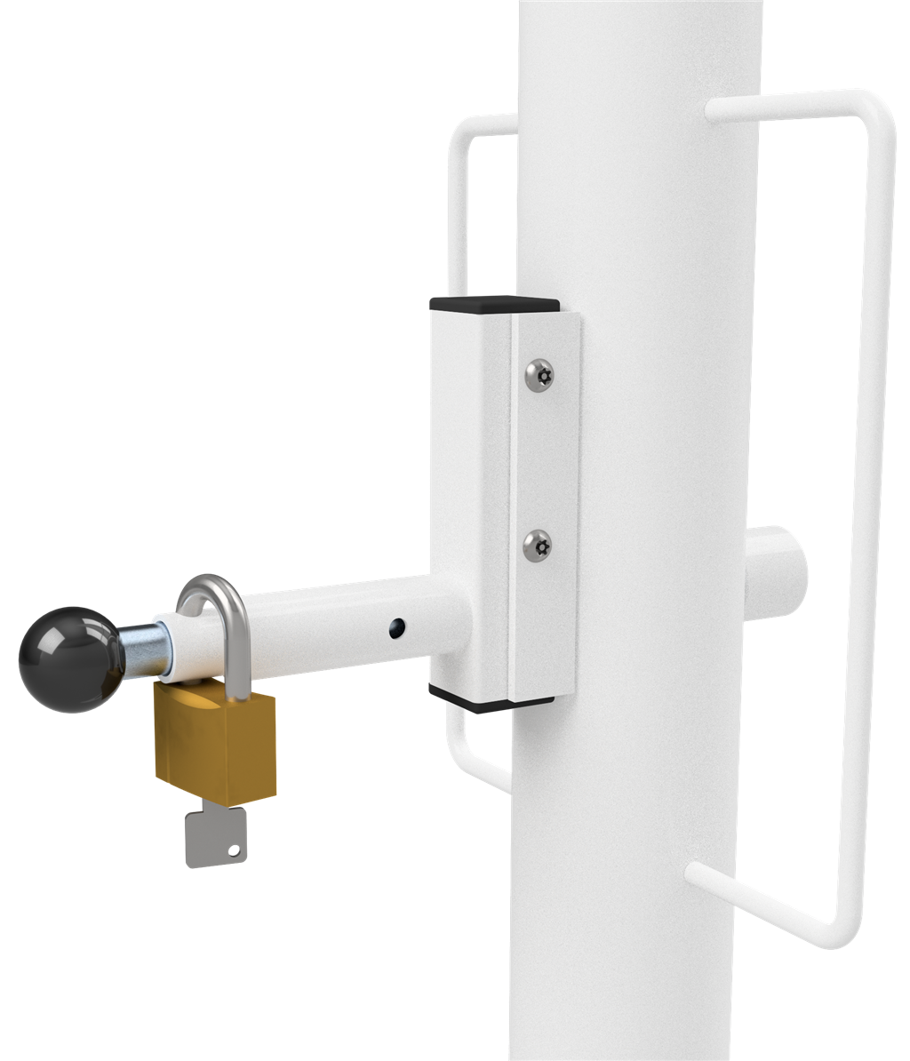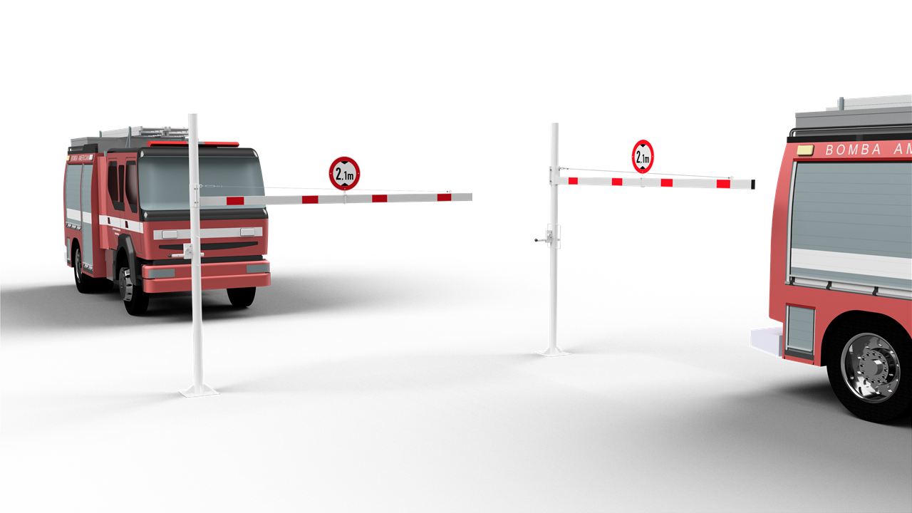 Höhenbegrenzer Horizontal schwenkbar, mit Seilzugverstärkung, Verriegelung geschlossen oder geöffnet mit Bolzen, vorgerichtet für Vorhangschloss oder mit Dreikantverschluss nach DIN 3223 bzw. Profilzylinderschloss, weiß beschichtet mit rot reflektierenden Leuchtstreifen 1-teilig Drehpfostenm aus Stahlrohr Ø 102 mm Querrohr aus Aluminium 100 x 50 mm Durchfahrtshöhe variabel einstellbar ca. 1800 mm - 2800mm Gesamthöhe Überflur ca. 3000 mm