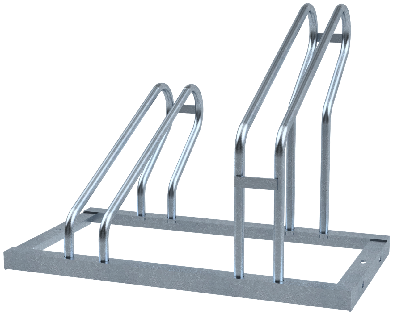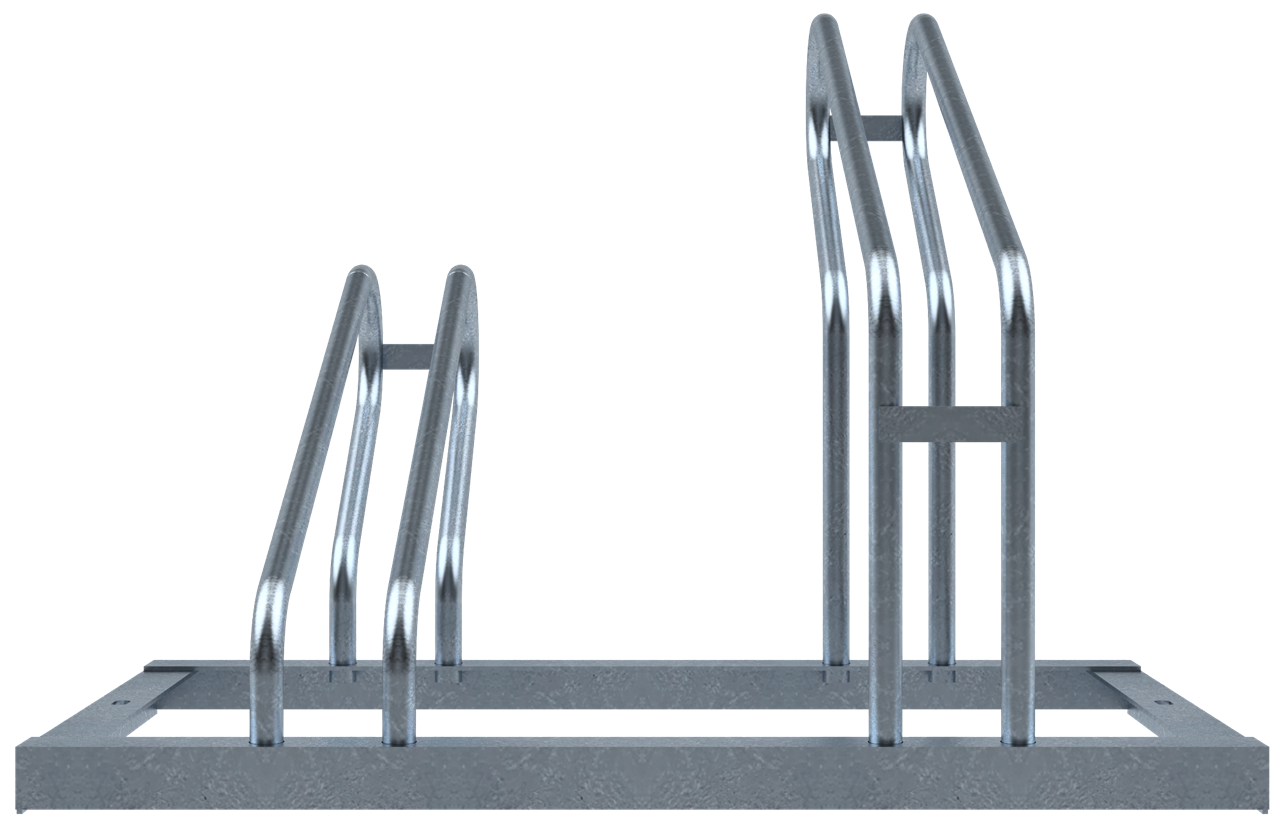 Fahrradständer ·Rahmen aus Winkelprofil ·Bügel 19 mm Rundrohr ·Höhe: ca. 510 mm, abwechselnd Hoch- / Tiefstellung ·Fahrradreifenbreite bis 55 mm
