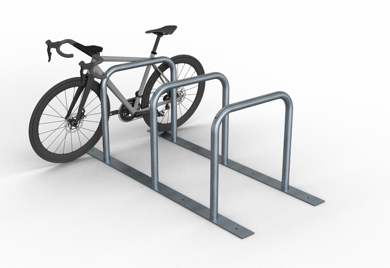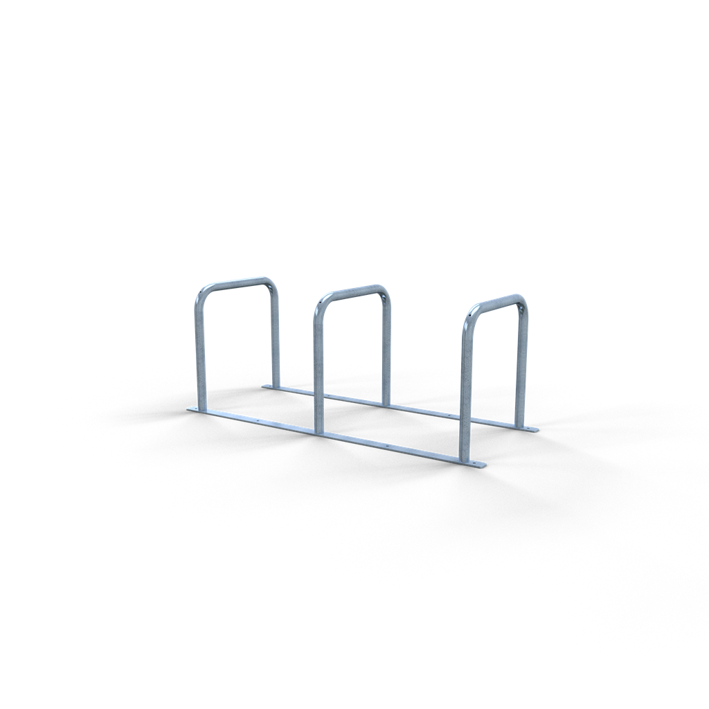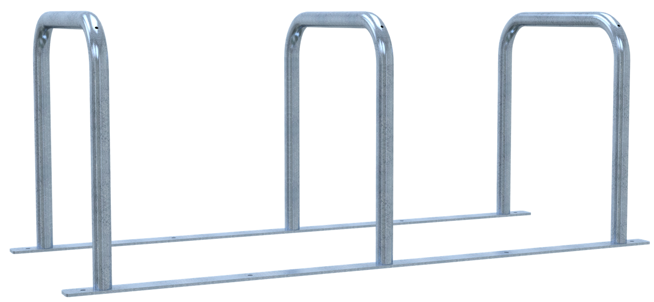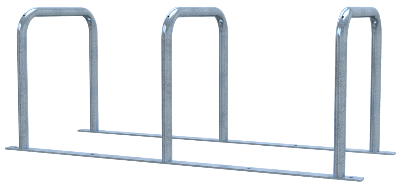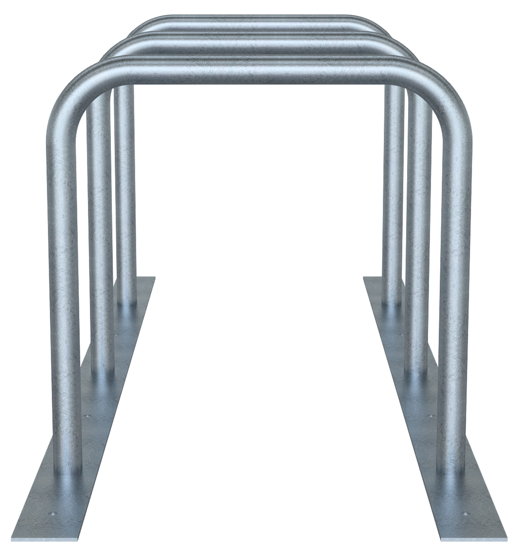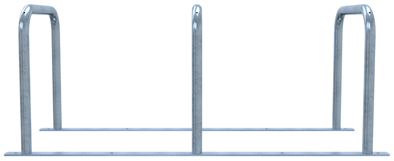 Fahrradanlehnständer bestehend aus drei Anlehnbügeln, Stahlrohr Ø 48 mm verschweißt auf Flacheisen 60 x 8mm, 1800 mm lang, mit Bohrungen zum evtl. Festdübeln, Gesamtbreite: ca. 700 mm, Radabstand: ca. 800 mm, Höhe: ca. 700 mm über Flur Flexibel aufstellbar - wahlweise in gerader oder schräger Position bei der schraubbaren Variante