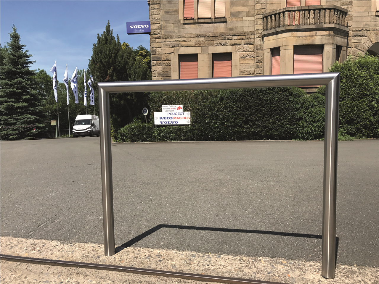 Edelstahlfahrradanlehnbügel Ø 48 mm Edelstahlbügel Ø 48 mm ·Oberfläche geschliffen ·Gesamtbreite ca. 1400 mm ·Höhe Überflur ca. 850 mm