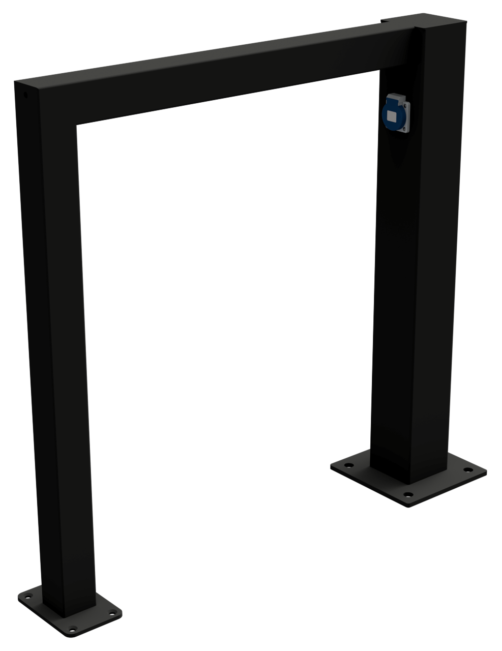 E-Bike - Anlehnbügel - Einzelbügel ·aus feuerverzinkten und pulverbeschichtetem Vierkantrohr ·inklusive IP 54 Ausgangssteckdose 230V mit Schutzdeckel ·Breite: 800mm ·Gesamthöhe: 800 mm ·mit Bodenplatten zum Aufdübeln