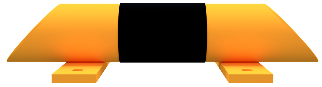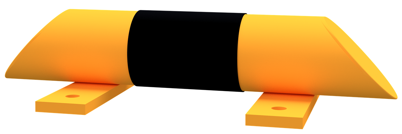 Rammschutz-Balken Stahlrundrohr Ø 76 mm, zum Aufdübeln mit abgeschrägten Enden, Bodenplatten 200 x 50 x 10 mm, gelb pulverbeschichtet mit schwarzen Streifen, stoppt und schützt Höhe Überflur 86 mm