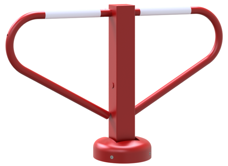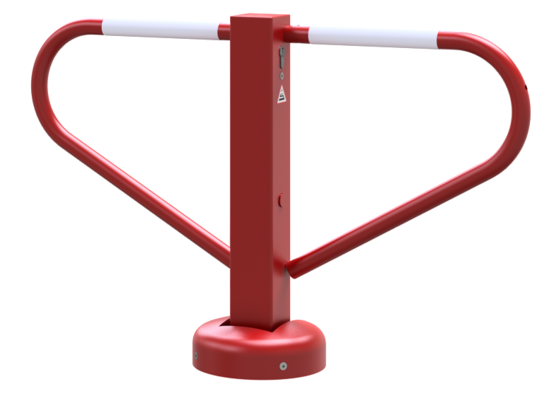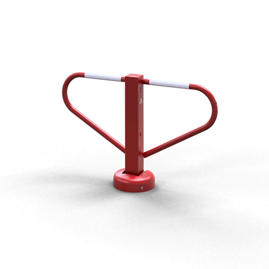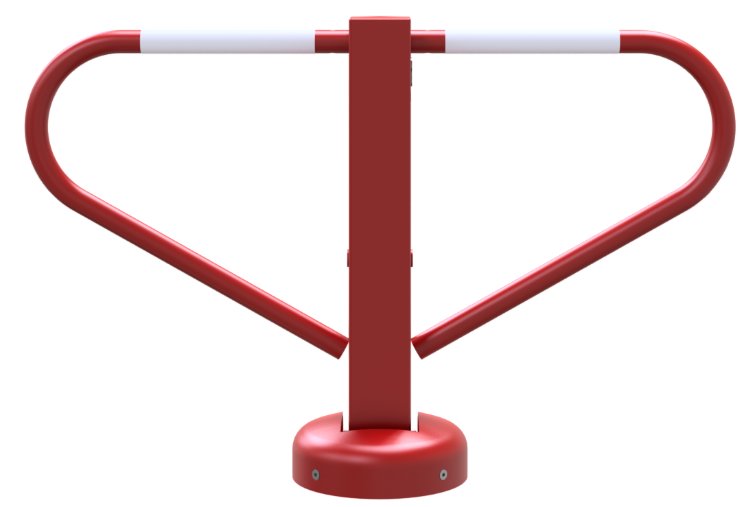 Anfahrsichere Parkplatzsperre elastisch bei Schub- oder Stoßkraft, Vierkantrohr 70 x 70 mm, Überflur 500 mm, Überfahrhöhe ca. 95 mm, mit seitlichen Rundrohrbügeln, Gesamtbreite ca. 800 mm umlegbar, mit Profilzylinderschloss drei Schlüssel, selbsteinrastende Verriegelung für Dübelbefestigung mit Bodenplatte Ø 200 mm oder zur Befestigung an Bodenhülse Art.-Nr. 470.60 feuerverzinkt und rot beschichtet mit weiß reflektierenden Leuchtstreifen