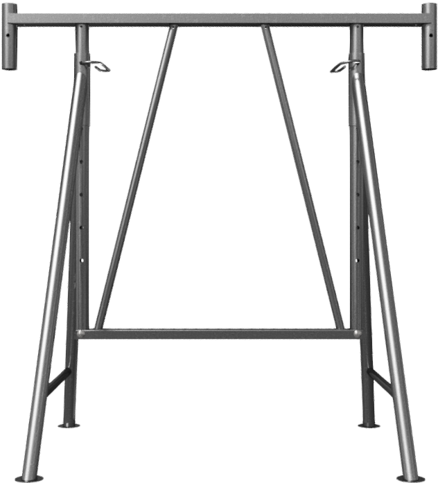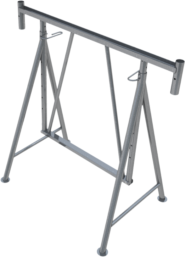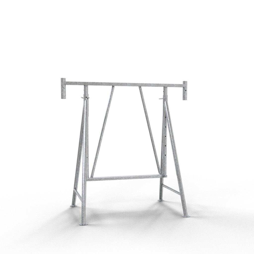 Faltgerüstbock System FS 1200 stabile Stahlkonstruktion mit U-Profil zur Aufnahme von Systembohlen und handelsüblichen Gerüstdielen, ink. seitlich angeschweißte Rohraufnahmen für Geländerpfosten der Art Nr. 11277VG Standfüße aus 42Ømm Rundrohr mit 2 Grundplatten zur standfesten Positionierung auf jedem Untergrund.Füße drehbar für platzsparende Lagerung. Höhenverstellbar durch einfaches ausziehen und arretierbar durch G-Haken in die gewünschte Höhe. Höhenverstellung von 1,20m - 1,95m Auflagebreite: 1,20m Tragkraft: 1500 Kg Ausführung. feuerverzinkt