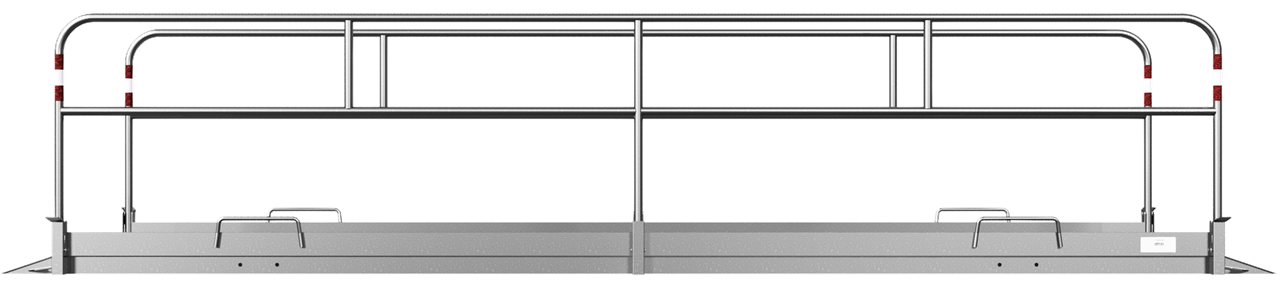 Grabenbrücke aus Aluminium Für den sicheren Übergang über Gräben und Kanäle. ·komplett aus Aluminium ·mit Auffahrrampe für Rollstühle, Kinderwagen, etc. ·Belag besteht aus rutschsicherem Alu-Tränenblech 3/4 mm ·seitliche Absicherung des Fußraums durch Alu-Bordbretter ·Geländer sind mit rot-weiß-roten Reflektorstreifen ausgestattet ·beidseitig angeschweißte Tragegriffe ermöglichen ein ergonomisches Handling ·vier eingearbeitete Stapelwinkel ermöglichen einen sicheren Transport sowie eine ordentliche Lagerung ·durch vier eingearbeitete Ösen können die Brücken mit dem Erdnagel Art.-Nr. 30W80 gegen Verrutschen gesichert werden ·Tragfähigkeit: 200 kg/m²