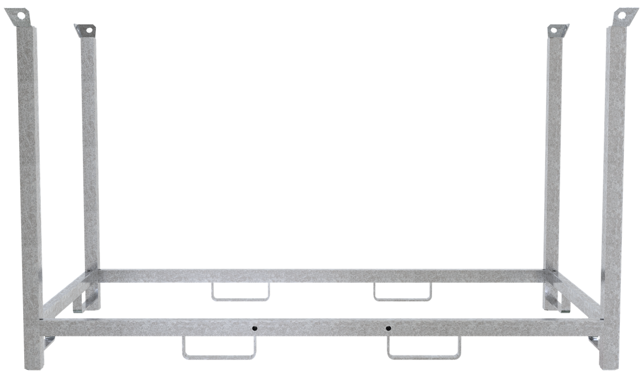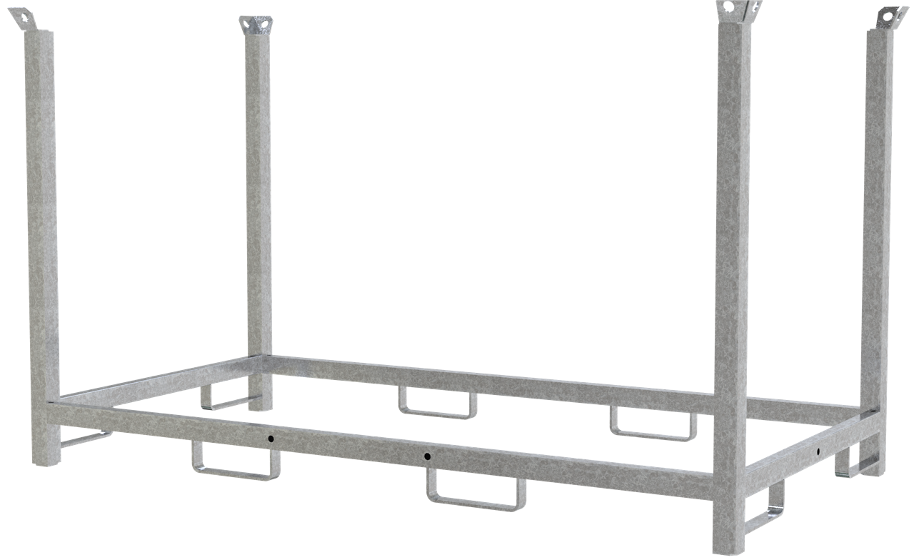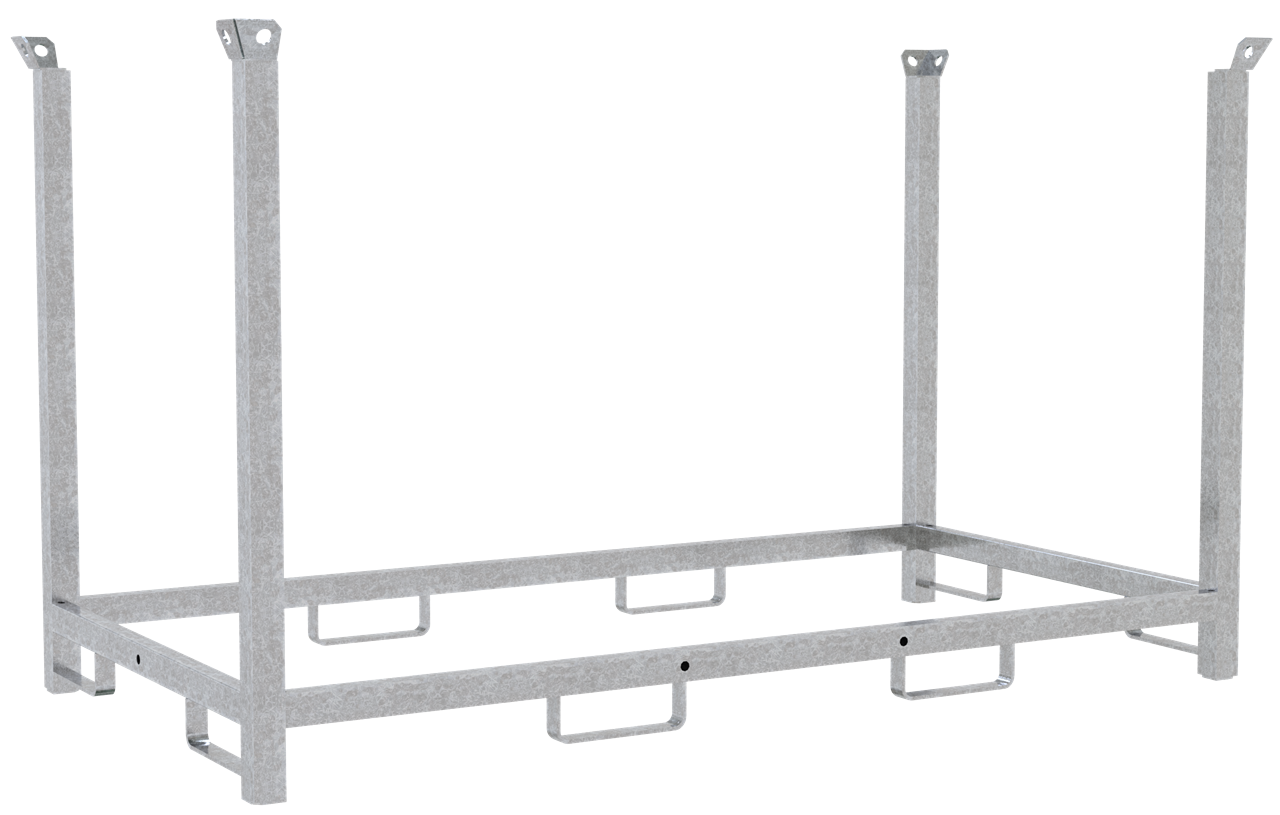 · Stapelpalette kranbar, zweiseitig unterfahrbar · kombinierbar mit 3B214-36 Standrohre und Querholme aus 60 x 60 mm Vierkantrohr gefertigt · 4-fach stapelbar · Füllmaße: 2,10 m x 1,00 m x 1,10 m · Ausführung: verzinkt