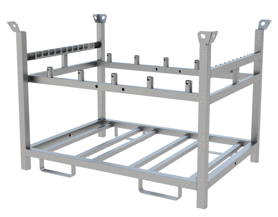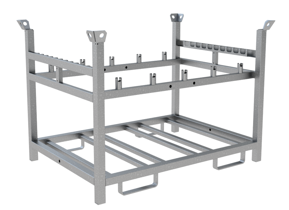 Lager- und Transportpalette für Bakengarnitur. · für 10 x Fußplatten, 10 x Bakenleuchten und 10 x Baken · sowohl für Stapelverkehr als auch für den Kranbetrieb geeignet · Außenmaße: 1378 x 1000 x 960 mm · verzinkt