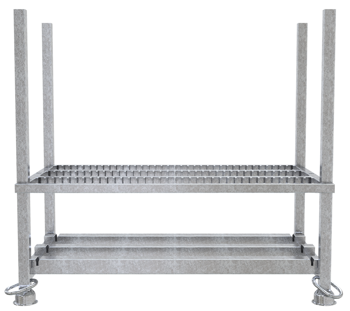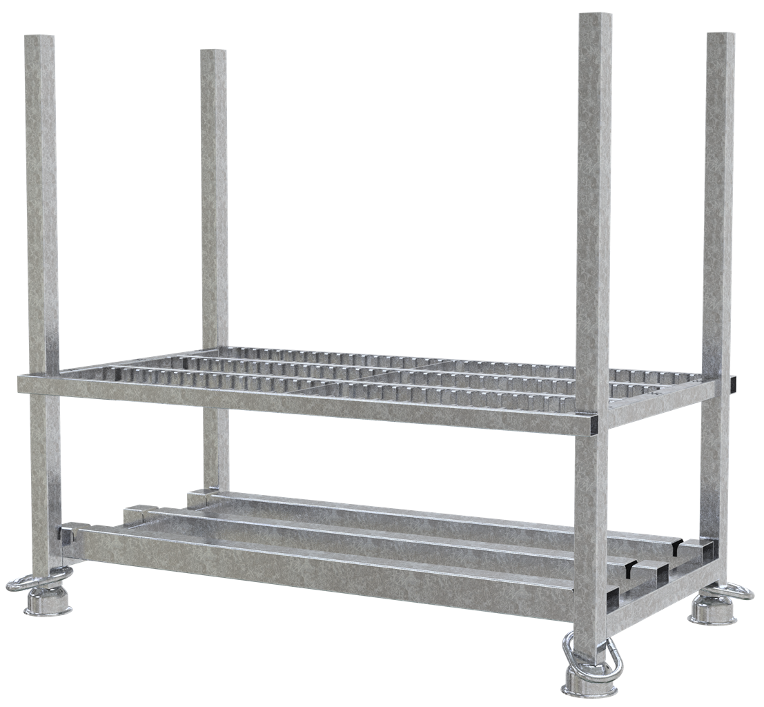 · für 108 Flachbaken · Standrohre aus 50 x 50 mm · Querrohr aus stabilen Material verschweißt · für den Kranbetrieb geeignet · durch die Kontur der Tulpenfüße lassen sich die Paletten standsicher stapeln · Ausführung: verzinkt