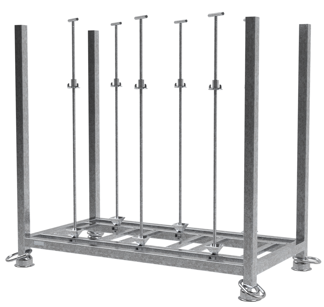 Palette für Leitkegel Stapelpalette zur Aufnahme von sowohl ein- als auch zweiteiligen Schake Leitkegeln. ·inkl. Kranösen und 6 herausnehmbarer Sicherungsanker mit Gewinde um individuell je nach Füllmenge zu sichern ·stapelbar ·verzinkt ·kombinierbar mit Palette 50381V/ 50381-115V