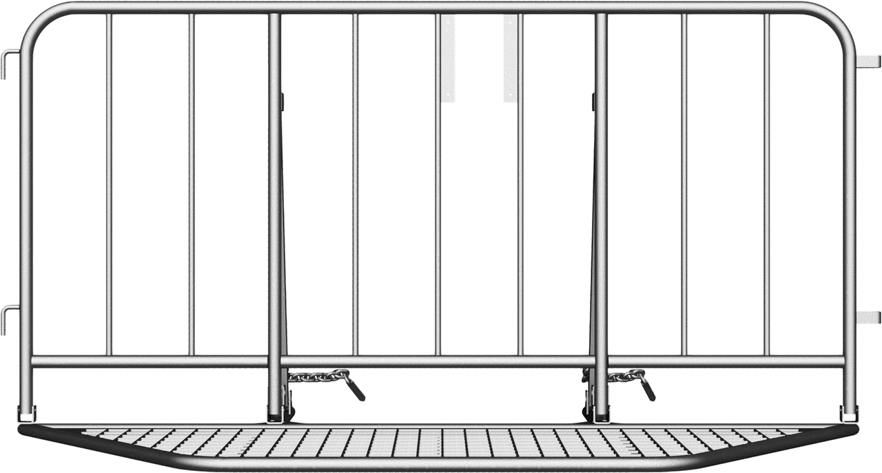Polizeigitter robustes Stahlgestell für besondere Einsatzbedingungen, aus Ø 33,7 mm Rundrohr verschweißt, seitlich am Gestell sind Haken und Verbindungsbügel angeschweißt, die ein Verbinden mehrerer Elemente ermöglichen, Fußteil ist klappbar und mit stabilem Gittereinsatz versehen Abmaße: Höhe: 1,05 m, Tiefe: 1,00 m, Länge: 2,10 m Ausführung: verzinkt