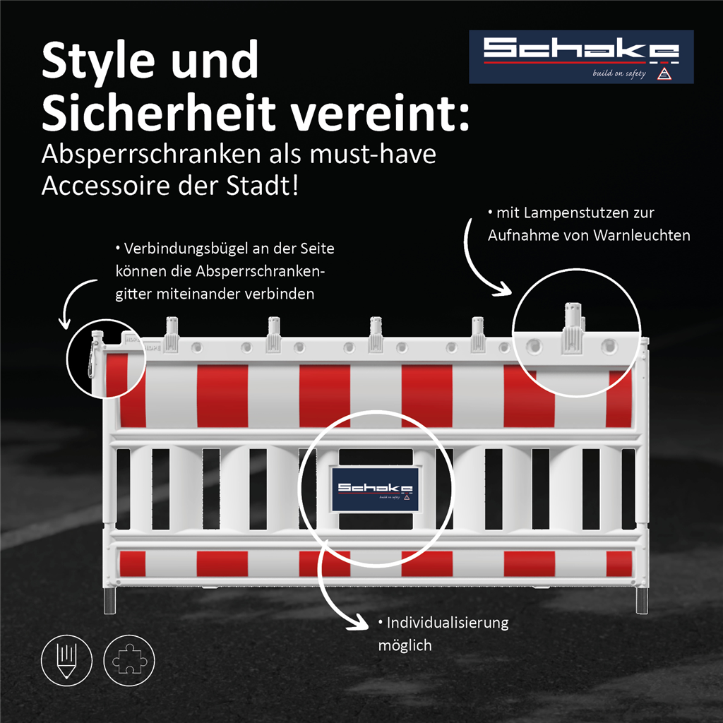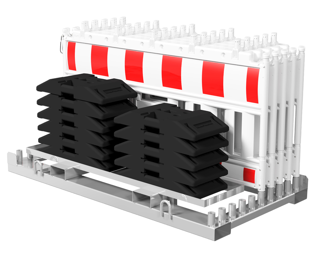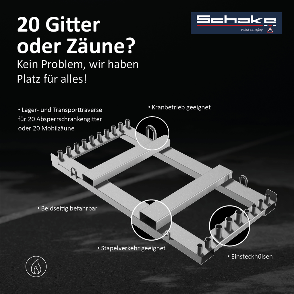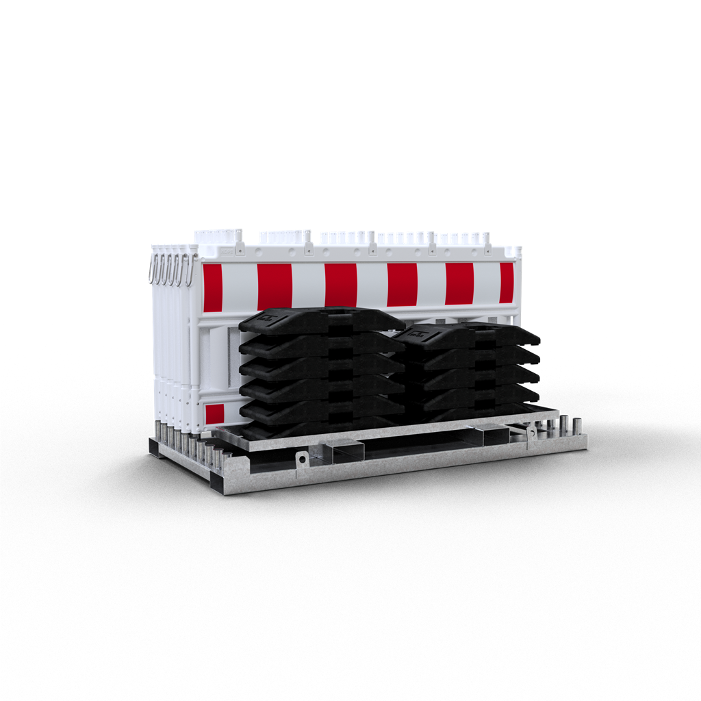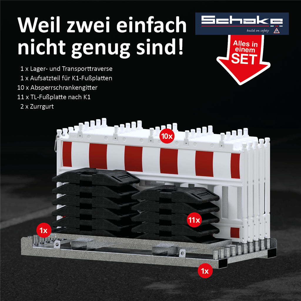 Absperrschrankengitter SET1 bestehend aus: 1 x Lager- und Transporttraverse für Absperrschrankengitter (Art.-Nr. 32000) 1 x Aufsatzteil für K1-Fußplatten (Art.-Nr. 32000-A) 10 x Absperrschrankengitter 11 x TL-Fußplatte nach K1, 30 kg (Art.-Nr. 31991) 2 x Zurrgurt 2-tlg. mit Ratsche (Art.-Nr. 50352-4)
