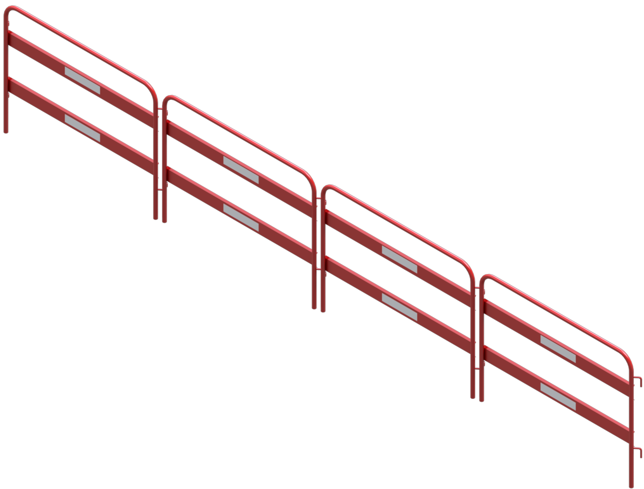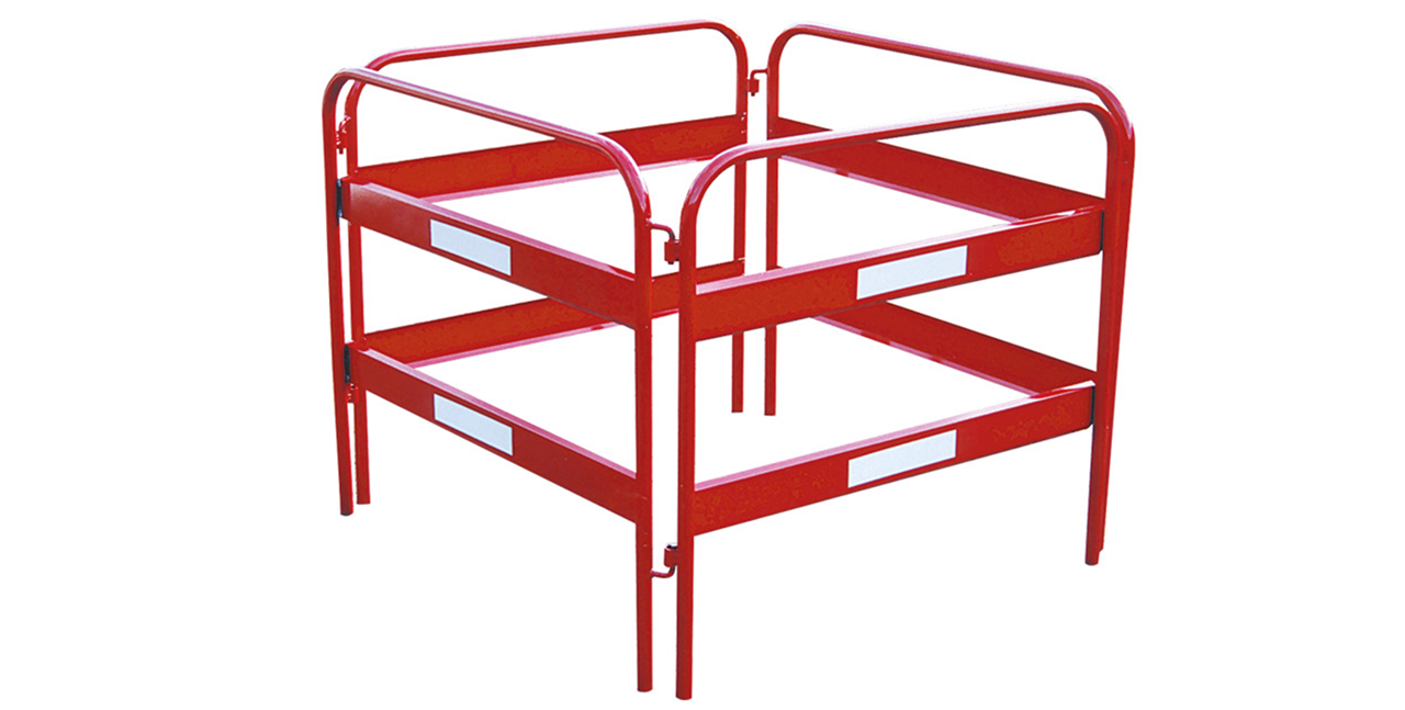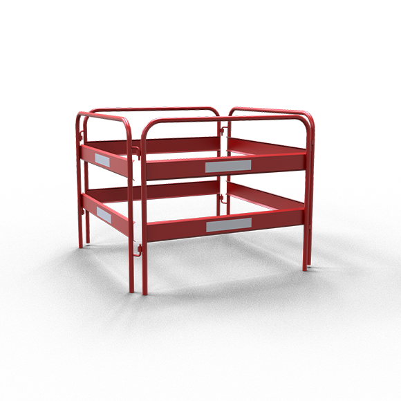 Schachtschutzgitter Zum Sichern von Gräben und anderen Baustellenbereichen. ·rot beschichtetes Stahlgestell mit weißen Reflexstreifen beklebt, die zusätzliche Sicherheit bieten. ·Grundgestell aus Ø 26,9 mm Rundrohr gefertigt ·Gesamthöhe: 0,90 m Jeweils 1 Element besteht aus 2 zusammenklappbaren Rundbögen, die drehbar, aber fest miteinander verbunden sind. Durch Hinzufügen von weiteren Elementen kann das Gitter unbegrenzt vergrößert werden.