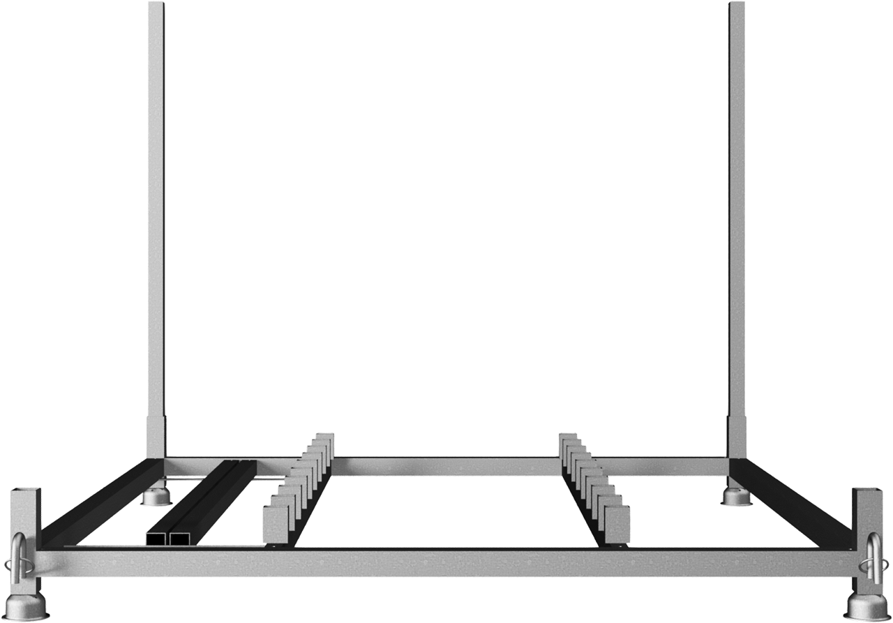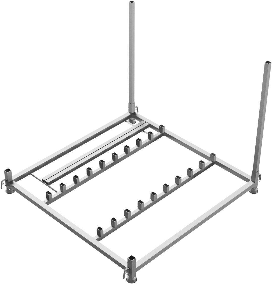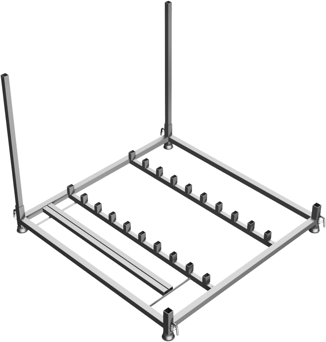 Stapelpalette für Polizeigitter Typ U Lichte Maße: 1900 x 1900 mm Länge der Holme: 1640 mm speziell für Lagerung und Transport von 10 Polizeigittern (Art.- Nr. 419.012) Grundkonstruktion aus 60 x 60 mm bzw. 60 x 40 mm Vierkantrohr verschweißt, herausnehmbare Holme Ausführung: verzinkt