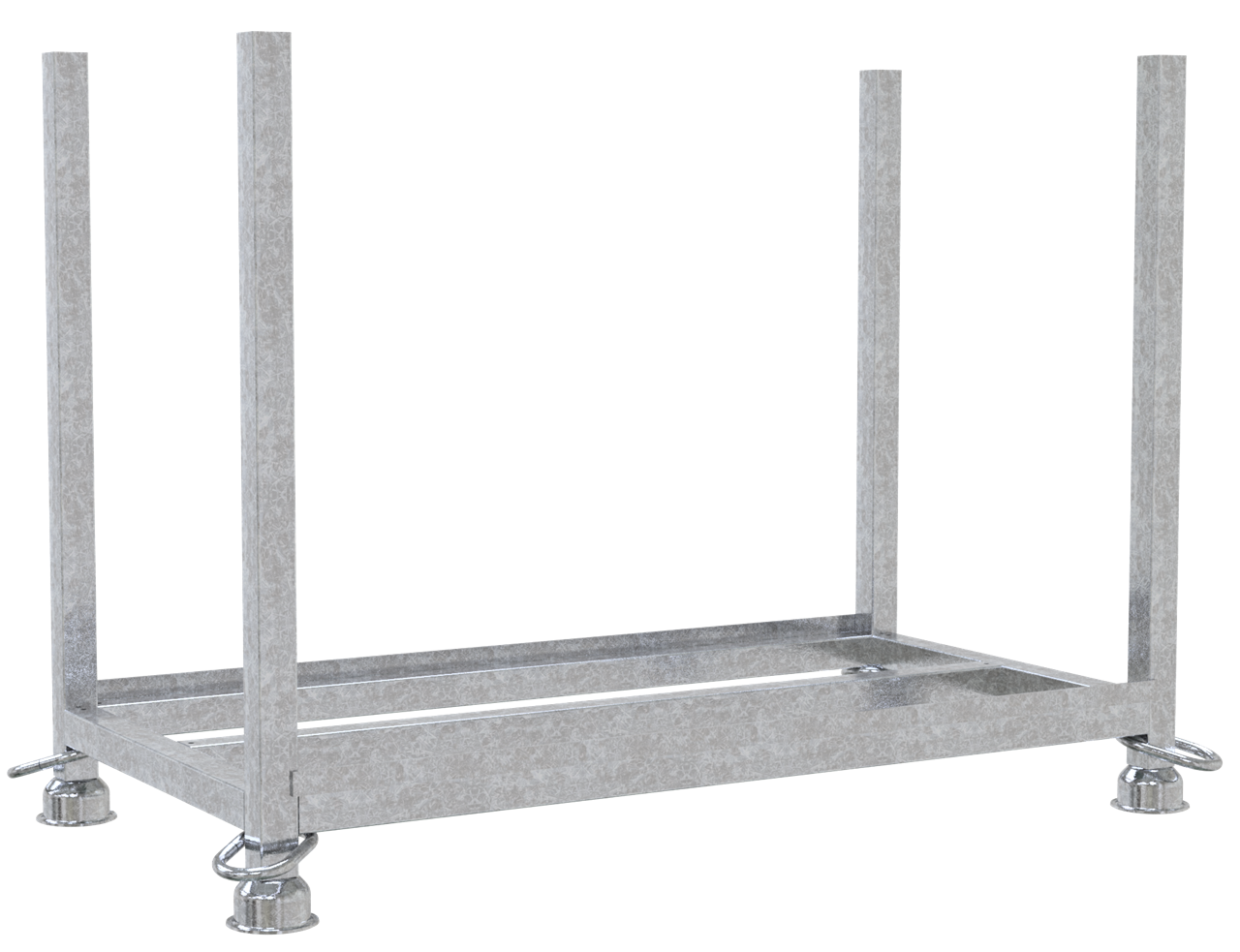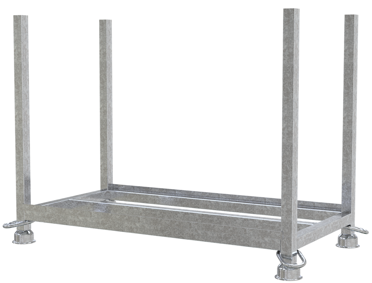 Stapelpalette für Bauzaunfüße für Lagerung und Transport von 25 Stk. Bauzaunfüßen 3F110 und 3F112 (5 Stk. Bauzaunfüße in der Breite und 5 Stk. Bauzaunfüße in der Höhe), Standrohre und Querholme sind aus 50 mm x 50 mm Vierkantrohr gefertigt inkl. Flachstahl zur Sicherung der unteren Lage Bauzaunfüße. Füllmaße: 1,30 m x 0,63 m x 0,90 m, mit zusätzlichem Mittelholm, sowohl für Stapler- und Hubwagenverkehr als auch für Kranbetrieb geeignet, durch die Kontur der Tulpenfüße lassen sich die Stapelpaletten standsicher stapeln, Zurrgurt für die Sicherung der Bauzaunfüße wird mitgeliefert. Ausführung: verzinkt