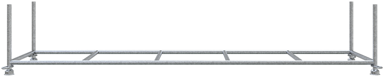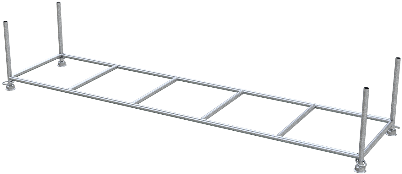 Stapelpalette Füllmaße: 4,00 m x 0,87 m x 0,60 m Belastung: 1,5 t sowohl für Stapler- und Kranbetrieb geeignet Standrohre und Querholme aus Ø 48,33 mm Rundrohr gefertigt mit 2 zusätzlichen Querholmen mit geschlossenen Ösen Ausführung: verzinkt