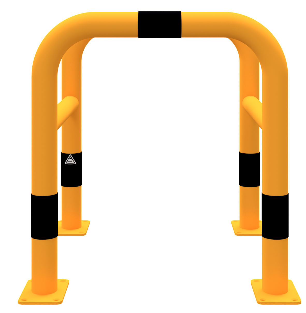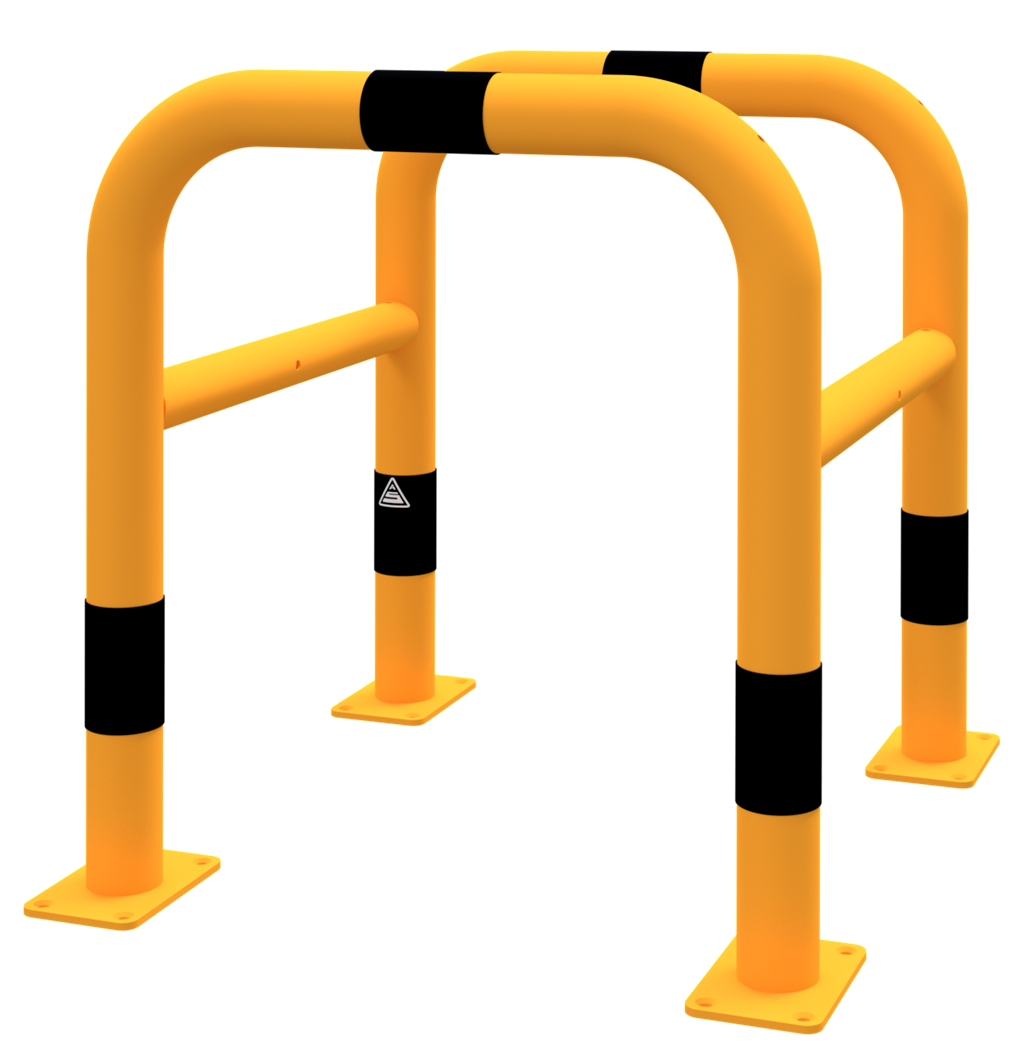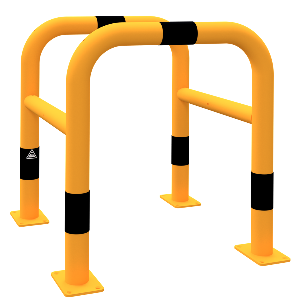 Umlaufender Baumschutz und Säulenschutz - zum Einbetonieren - bestehend aus 2 Steckbaren Rohrbügeln Ø60mm, mit angeschweißte Stutzen Ø48mm zum ineinanderstecken gelb beschichtet mit schwarzen Warnstreifen