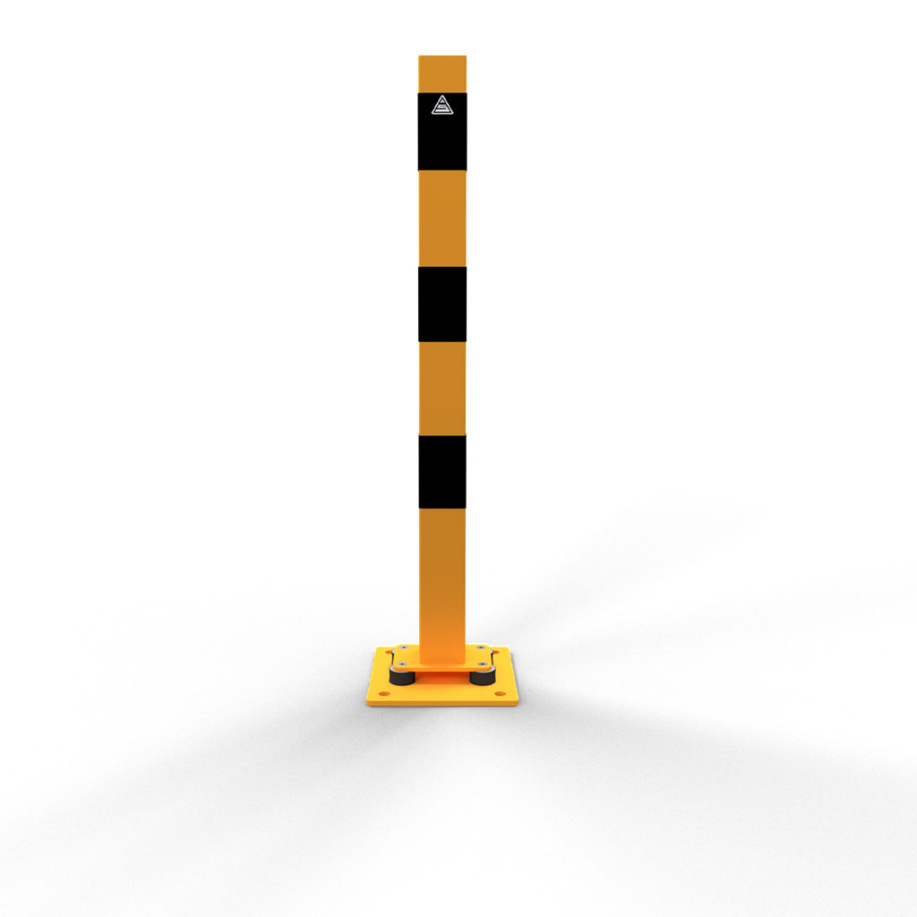 Elastischer Stahlrohr-Absperrpfosten mit aufgeschweißter Stahlkappe, ca. 1000 mm Überflur feuerverzinkt und gelb beschichtet mit schwarzen Streifen ortsfest, allseits neigbar zum Aufdübeln, ohne Abdeckklappe