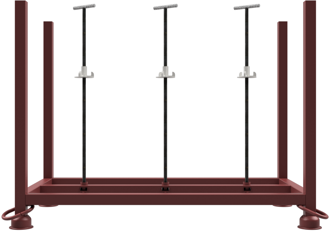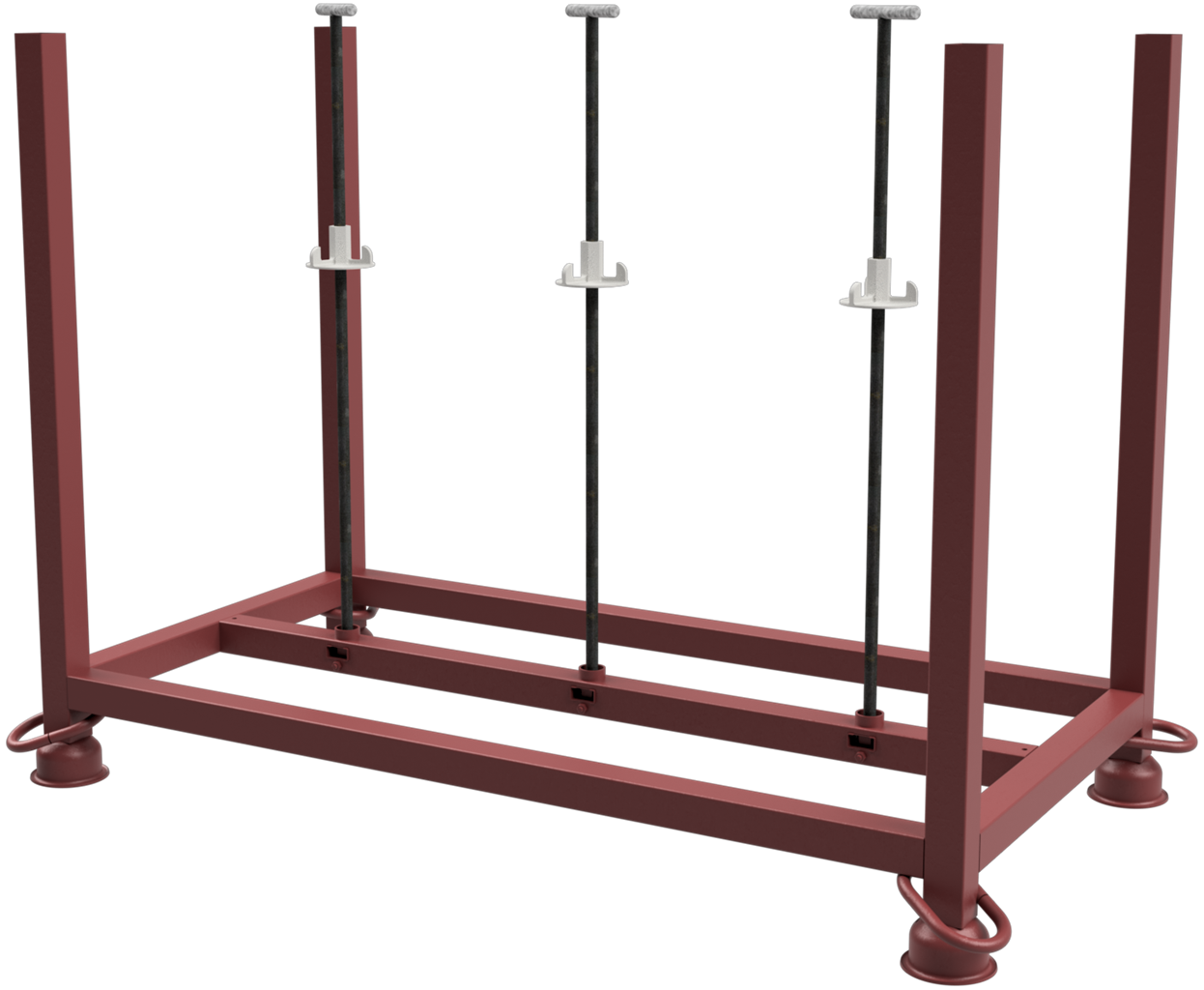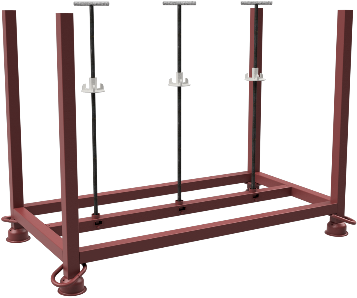· Standrohre und Querholme aus 50 x 50 mm Vierkantrohr · gefertigt mit eingeschweißter Mutter im unteren mittleren Vierkantrohr · die mit gelieferten Gewindestäbe arretieren die Fußplatten transportsicher auf der Palette Gewindestäbe auch einzeln auf Anfrage lieferbar.