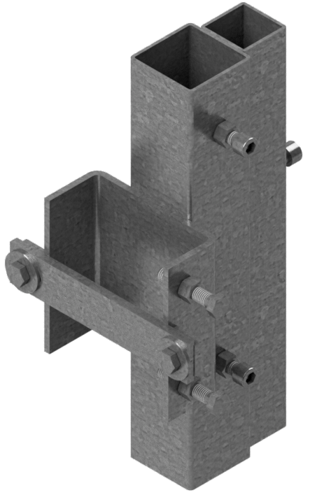Leitplankenhalterung nach TL - Typ 2 zur Aufnahme von 40 x 40 mm und 60 x 60 mm Schaftrohren,mit einem verschraubten Bügel wird die Leitplankenhalterung am Pfosten der Schutzplanke (Super-Rail, Sigma, IPE 100) befestigt Ausführung: verzinkt