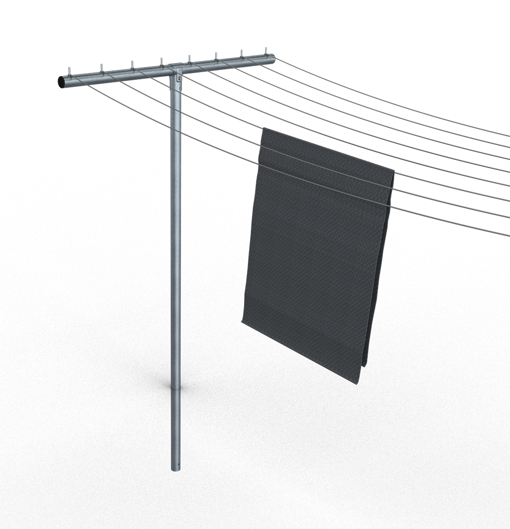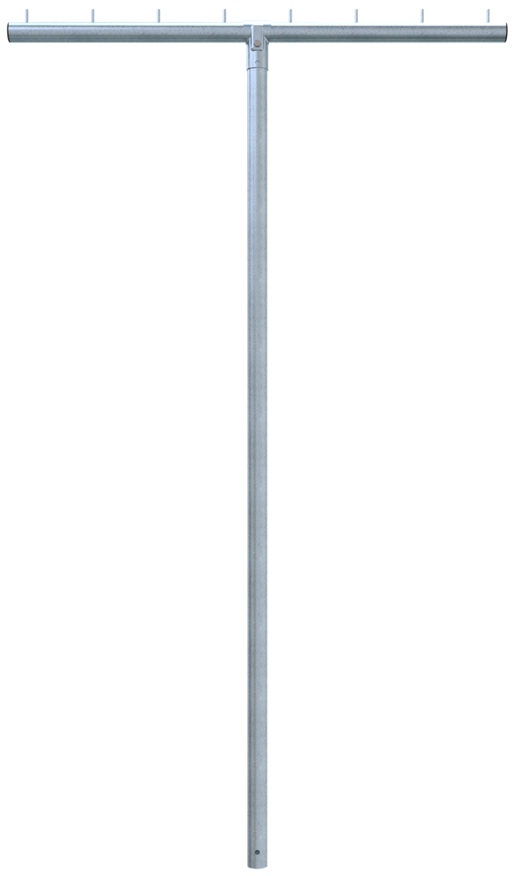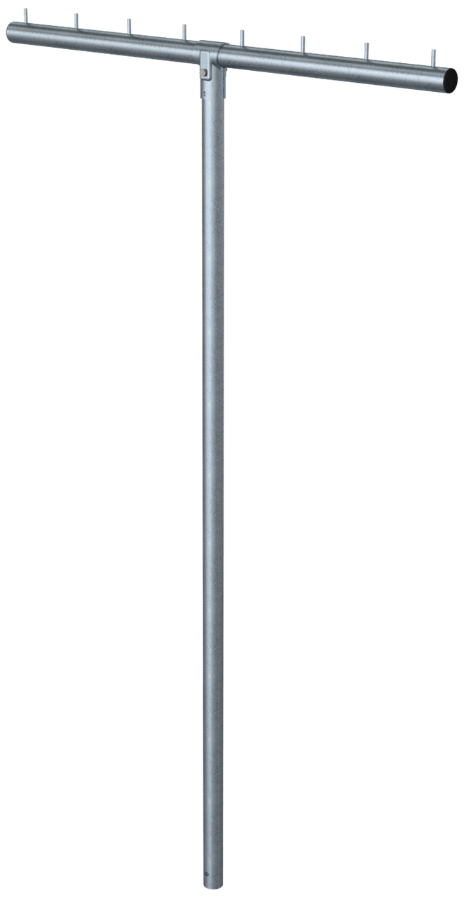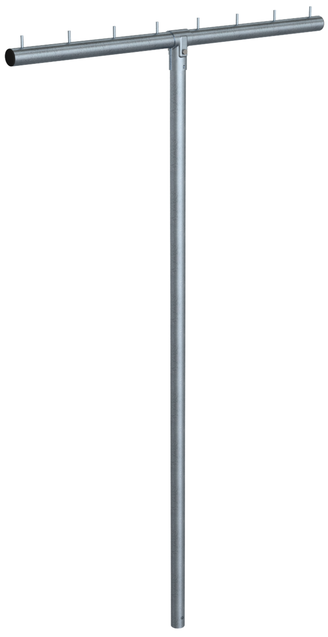 Wäschetrockengerüst T-Form, aus Stahlrohr Ø 60 mm Querrohr mit 8 Rundstiften Ø10x40mm T-Verbinder, 2-teilig mit Schraube M10 Standpfosten 2500 mm Gesamtbreite 1500 mm mit Erdanker, feuerverzinkt