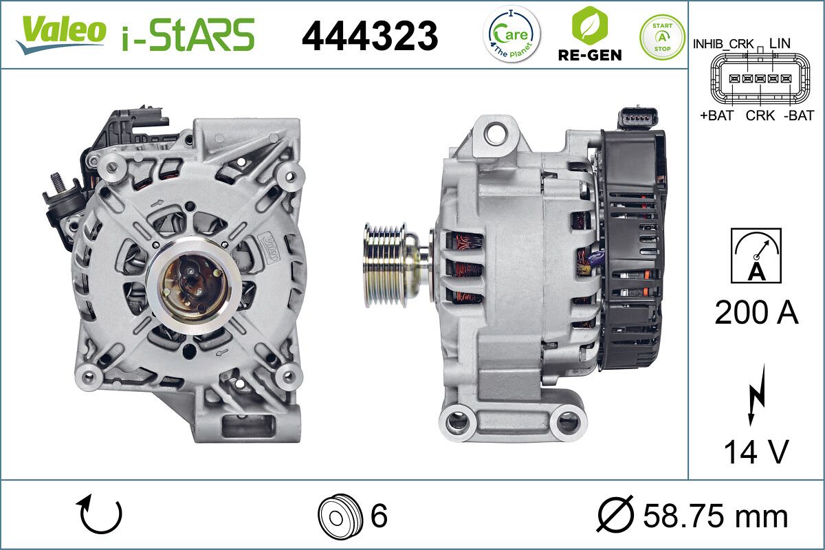Austauschteil: · Fahrzeugausstattung: 301 · Spannung [V]: 14 · Generator-Ladestrom [A]: 200 · Drehrichtung: 0 · Riemenscheiben: 0 · Riemenscheiben: 2 · Rippenanzahl: 6 · Riemenscheiben-Ø [mm]: 59 · Gewicht [kg]: 9.53