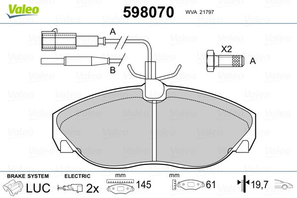 Einbauposition: VA · Bremssystem: LUCAS · Ergänzungsartikel/Ergänzende Info 2: 274 · Breite [mm]: 145 · Höhe [mm]: 61 · Dicke/Stärke [mm]: 19.7 · WVA-Nummer: 21797 · Verschleißwarnkontakt: 0 · Anzahl der Verschleißanzeigen [pro Achse]: 2 · Warnkontaktlänge [mm]: 200 · Betriebsart: EL · Ergänzungsartikel/Ergänzende Info 2: 451 · Prüfzeichen: ECE-R90 · Gewicht [kg]: 2.045