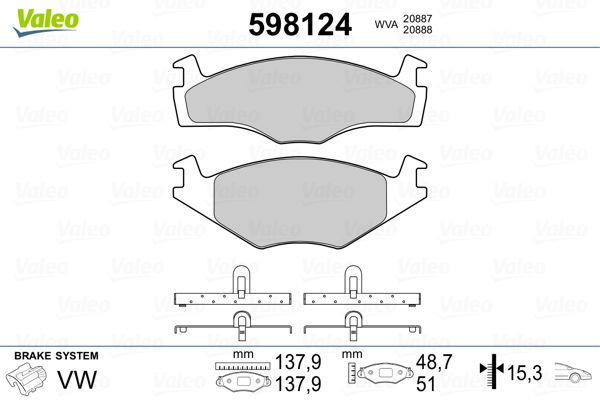 Einbauposition: VA · Bremssystem: VOLKSWAGEN · Breite [mm]: 138 · Höhe [mm]: 48.7 · Dicke/Stärke [mm]: 15.3 · Breite 2 [mm]: 138 · Höhe 2 [mm]: 51 · Dicke/Stärke 2 [mm]: 15.3 · WVA-Nummer: 20887 · WVA-Nummer: 20888 · Verschleißwarnkontakt: 50 · Ergänzungsartikel/Ergänzende Info 2: 451 · Schwingung: 0 · Prüfzeichen: ECE-R90 · Gewicht [kg]: 1.18