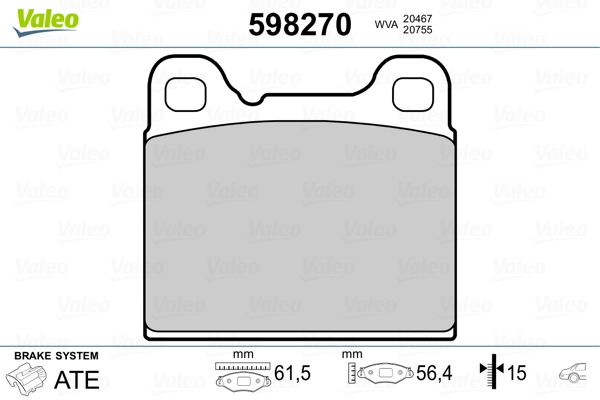 Einbauposition: HA · Bremssystem: TEVES · Breite [mm]: 61 · Höhe [mm]: 56 · Dicke/Stärke [mm]: 15 · WVA-Nummer: 20467 · WVA-Nummer: 20755 · Verschleißwarnkontakt: 50 · Ergänzungsartikel/Ergänzende Info 2: 451 · Prüfzeichen: ECE-R90