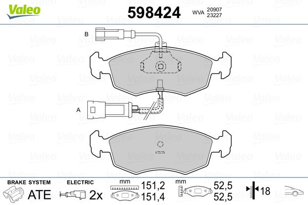 Einbauposition: VA · Bremssystem: TEVES · Breite [mm]: 151 · Höhe [mm]: 53 · Dicke/Stärke [mm]: 18 · Breite 2 [mm]: 151 · Höhe 2 [mm]: 53 · Dicke/Stärke 2 [mm]: 18 · WVA-Nummer: 20907 · WVA-Nummer: 23227 · Verschleißwarnkontakt: 0 · Anzahl der Verschleißanzeigen [pro Achse]: 2 · Warnkontaktlänge [mm]: 180 · Betriebsart: EL · Ergänzungsartikel/Ergänzende Info 2: 451 · Prüfzeichen: ECE-R90 · Gewicht [kg]: 1.504