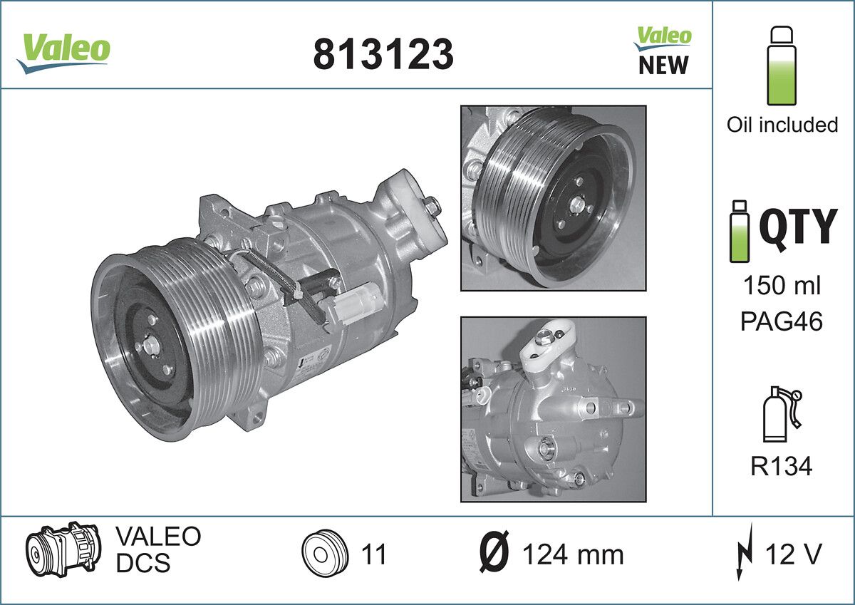 Neuteil: · Herstellereinschränkung: VALEO · Kompressor-ID: DCS · Kältemittel: 4 · Spannung [V]: 12 · Öl-Füllmenge [ml]: 150 · Riemenscheiben-Ø [mm]: 124 · Anzahl der Rillen: 11 · Ergänzungsartikel/Ergänzende Info 2: 502 · Kompressoröl: 0 · Gewicht [kg]: 6.87