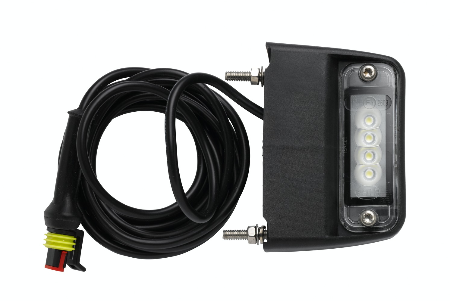- Mit 4 LEDs 1,0W, mit 2.010 mm Leitung und 2-poligem AMP-SUPERSEAL Steckanschluss, 2 Befestigungsschrauben M5 x 35, Gehäuse aus schwarzem Kunststoff