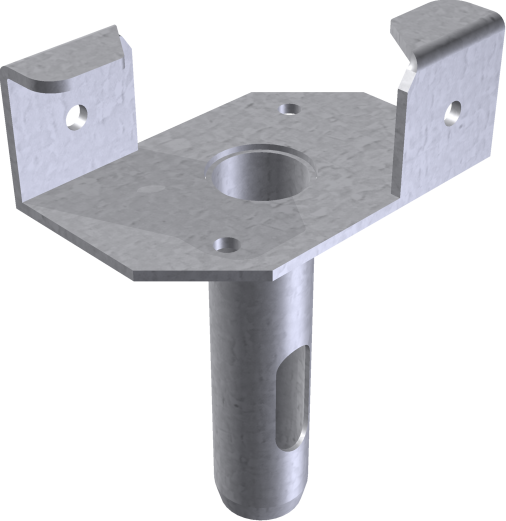 Haltekopf für Schalungsstützen Um auf den Schalungsstützen die Holzschalungsträger sicher aufzunehmen. ·verzinkt ·Rohr ø 38 mm ·zwei Winkel die in das Profil des Holzschalungsträgers eingreifen (Innenmaß 82 mm) und dazu dienen, dass die Holzschalungsträger nicht verrutschen können ·durch Bohrungsvorrichtungen in den Winkeln kann der Holzschalungsträger mittels Nagel gesichert werden ·Höhe ca. 45 mm